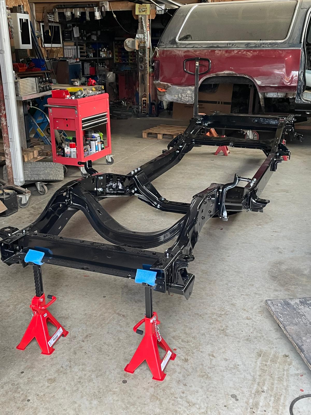 Bonsoir, belle peinture (Epoxy ?) Pas de micro fissures sur le rail du châssis au niveau de la fixation du boitier de direction ? Lames de ressorts d'origine ou vous en profitez pour le surélever ?