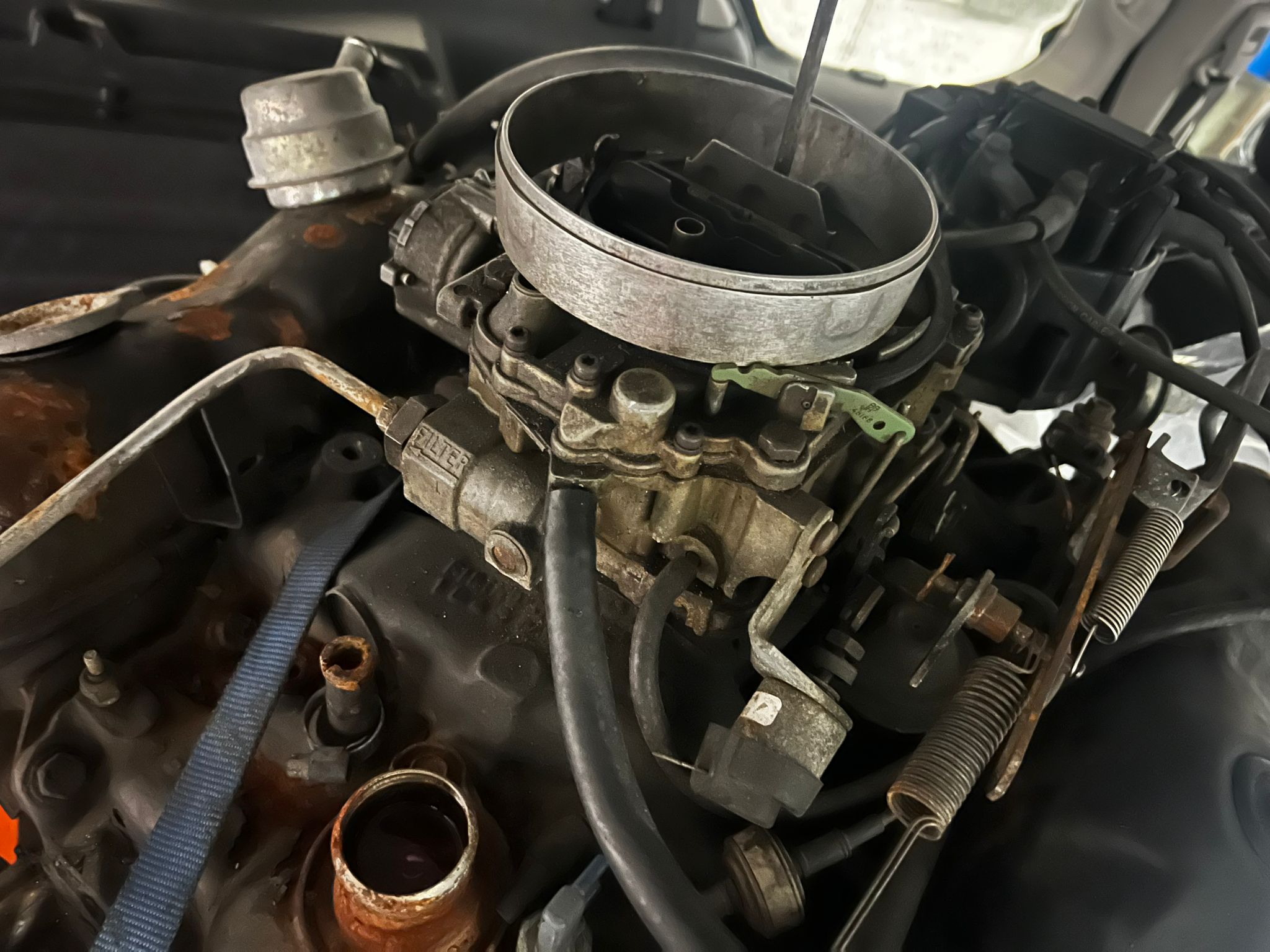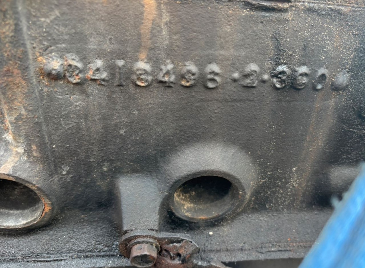 En inspectant les photos, je distingue ce qui ressemble à un J sur une des culasses, mais également un tuyau de pompe à air, et ainsi qu'un Quadrajet et un allumeur HEI :shock: ... intrigé je demande un peu d'infos au vendeur : numéro de fonderie, carbu, boite. L'essentiel.