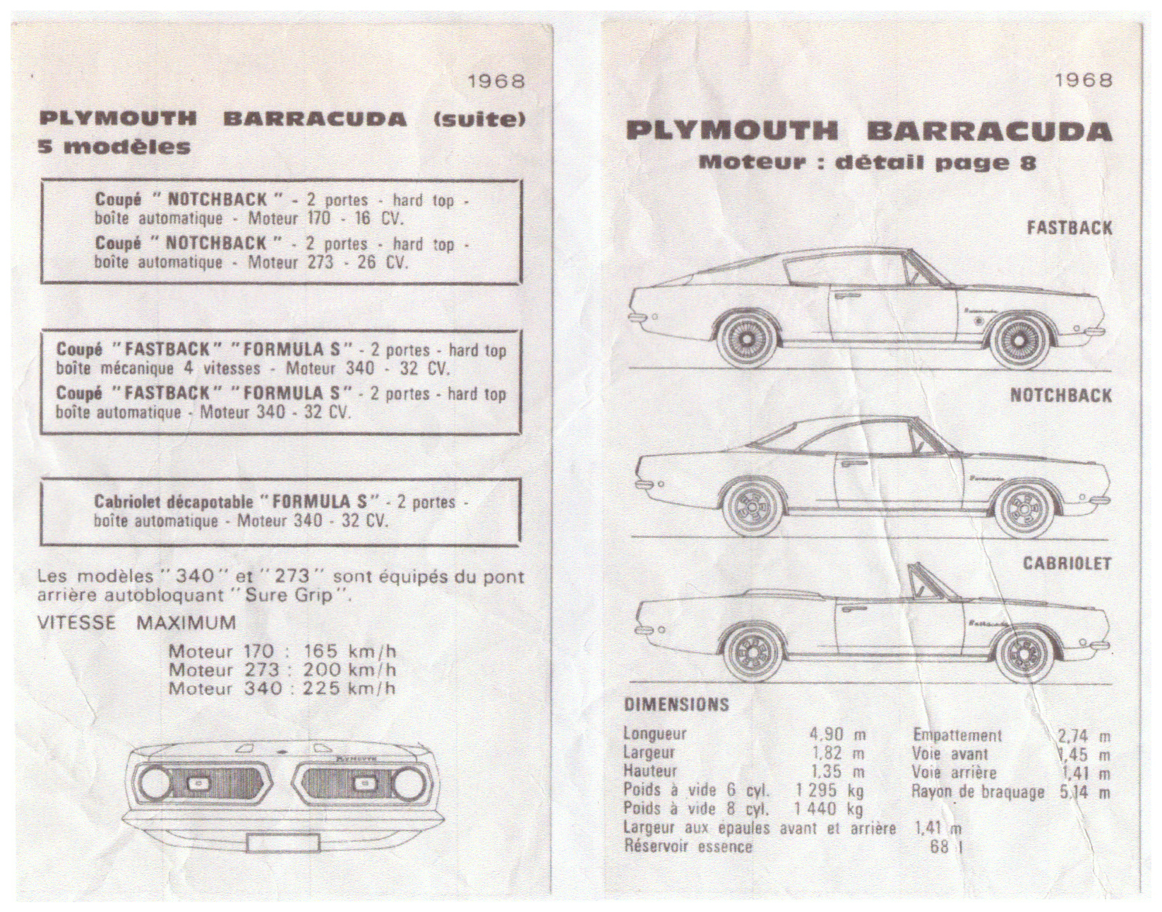 C'était un 273 sur cette voiture et il y avait une personne ( Rodolphe qui roule en charger 68 noire)sur le forum qui m'avaient passé un extrait du catalogue de 1968 à disposition des vendeur simca (d'ailleurs suite à un plantage d'ordi j'ai plus cette page si une bonne âme peut me la faire passer ou la publier), en 68 les ht ont des 273, les f/b des 340 et les cabrio des 340 je crois, mais il y a eu des 318 puisque j'en connait au moins un