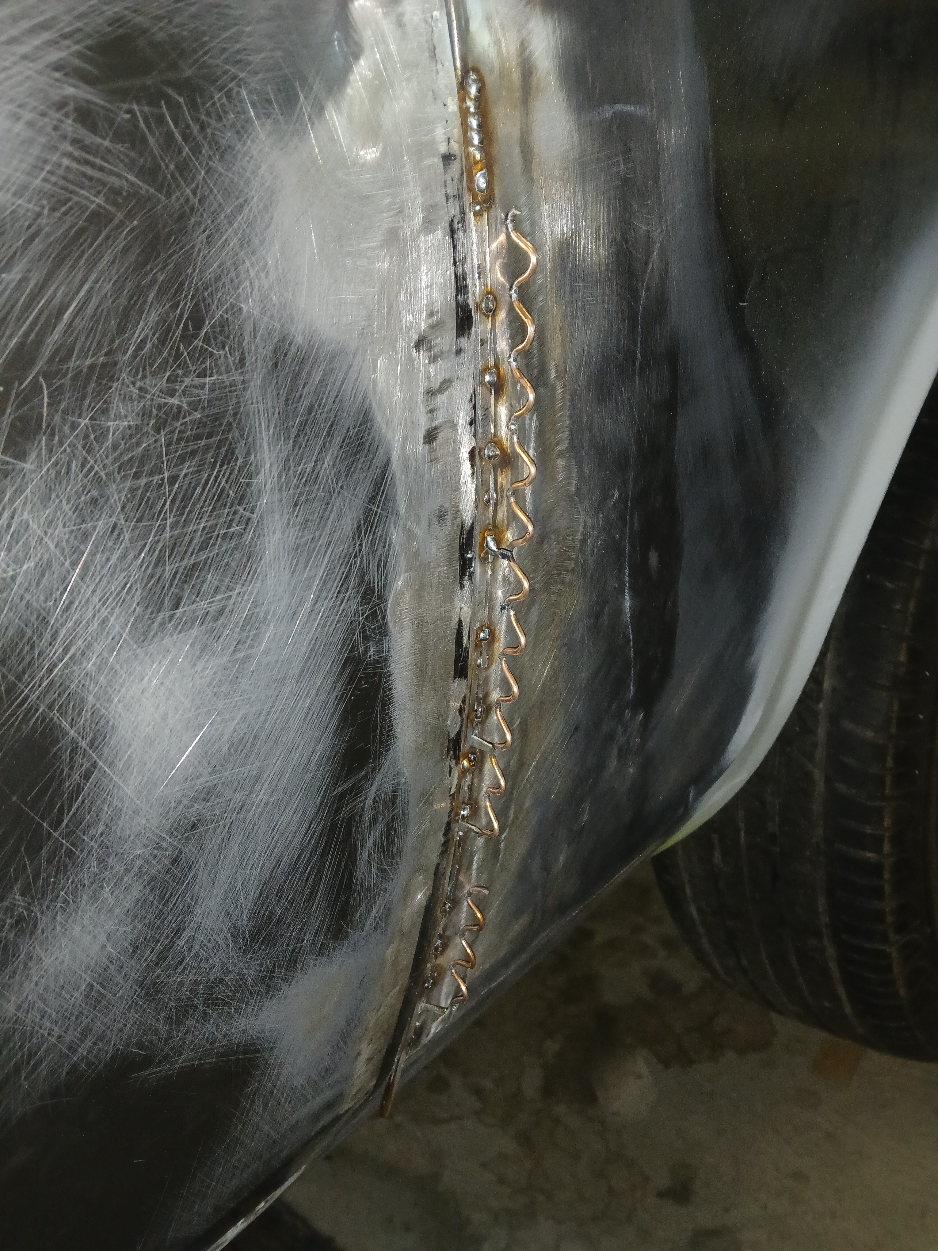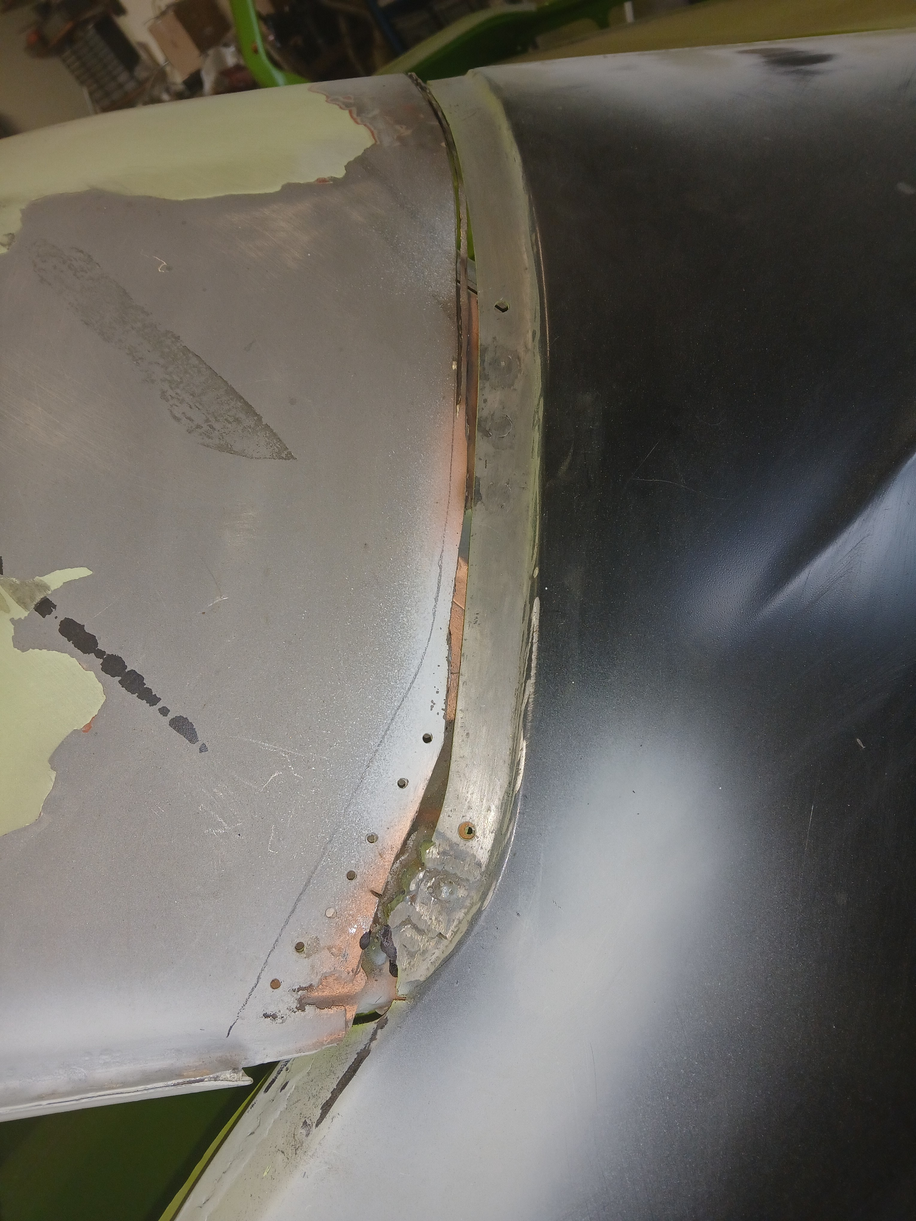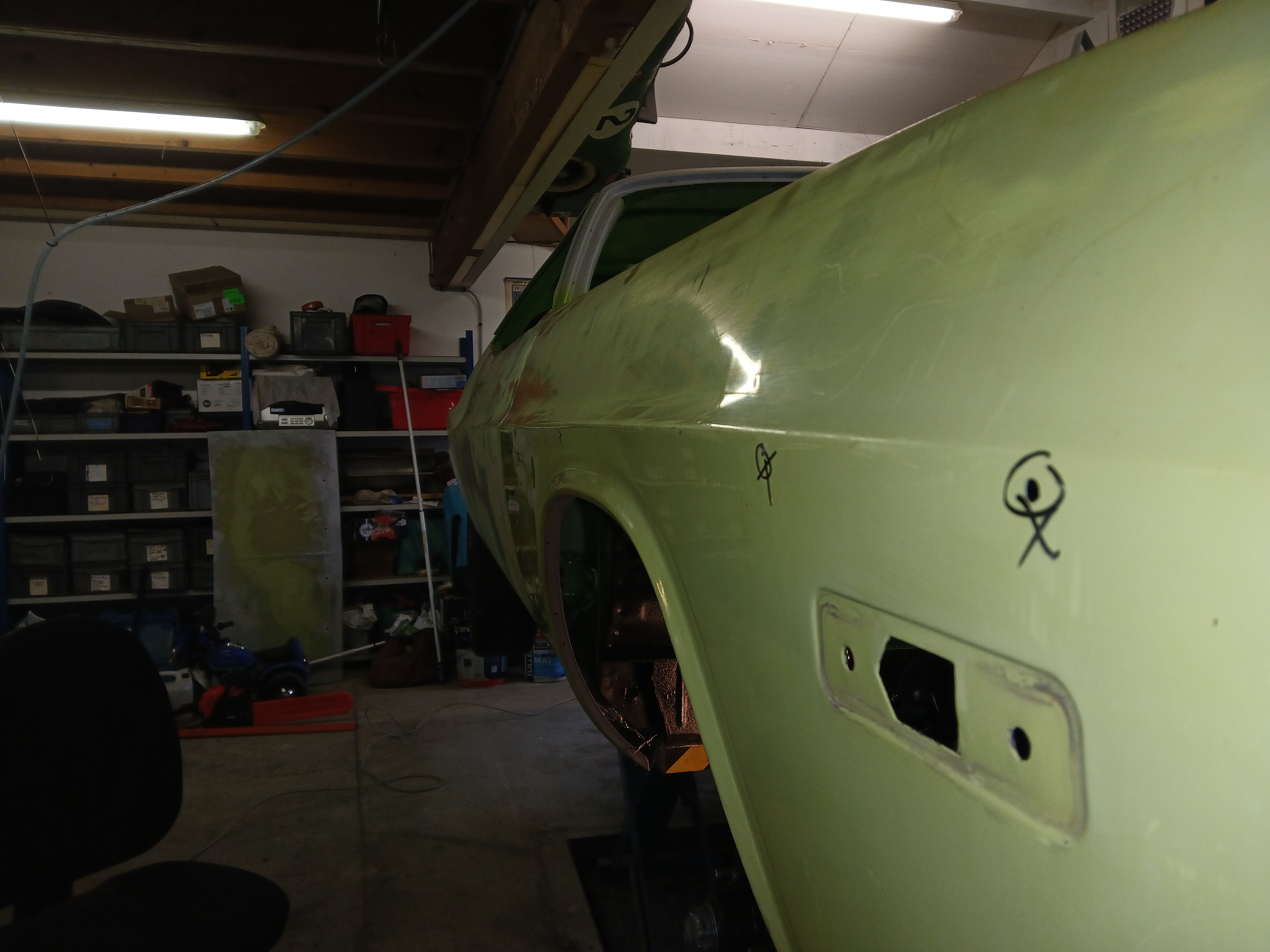 J'ai fini l'alignement des panneaux doté droit , rechargé un peu les arrêtes de portière pour égaliser les jours , et fait quelques patch par-çi par-là ... un vilain trou rempli de mastic