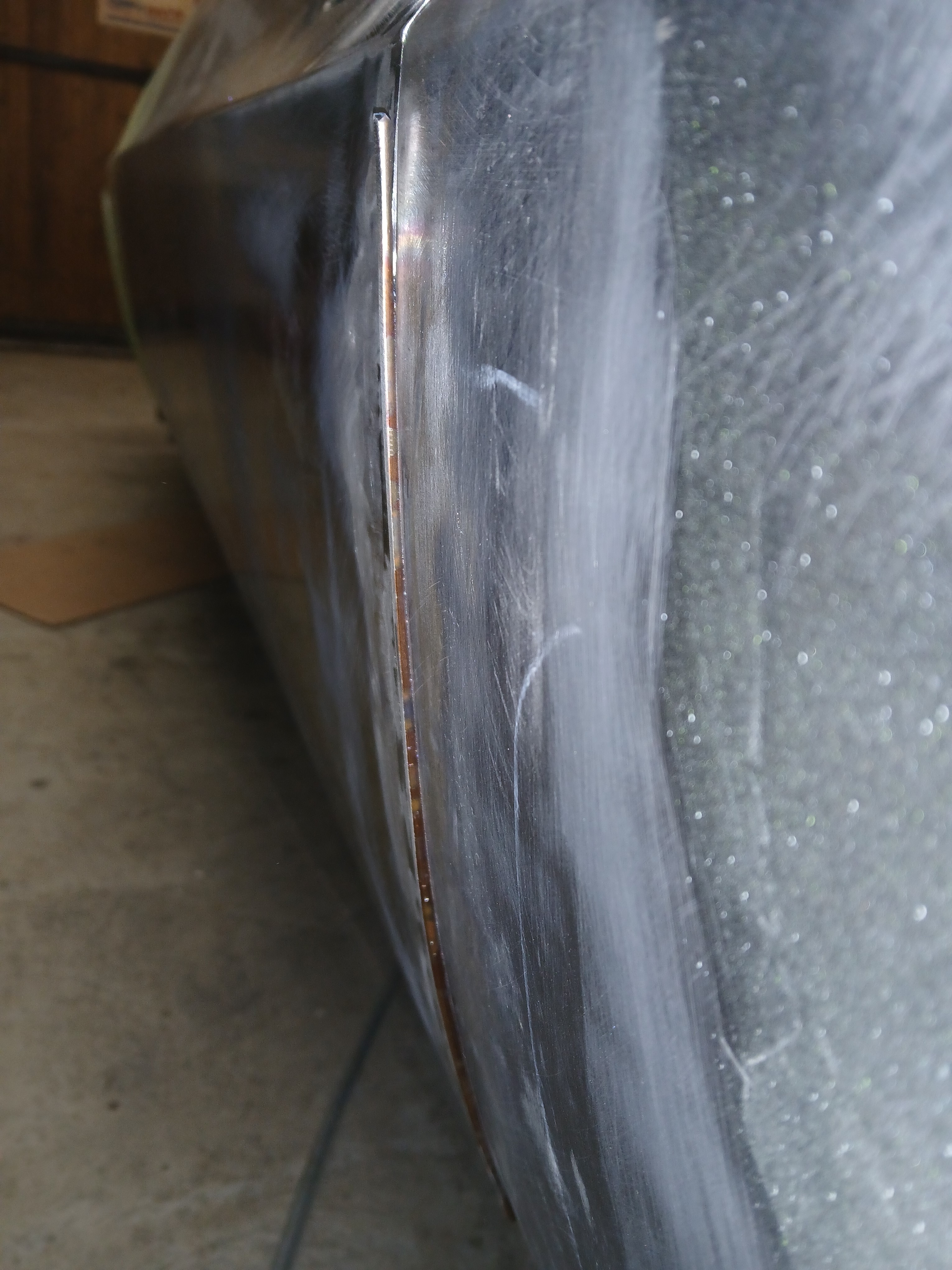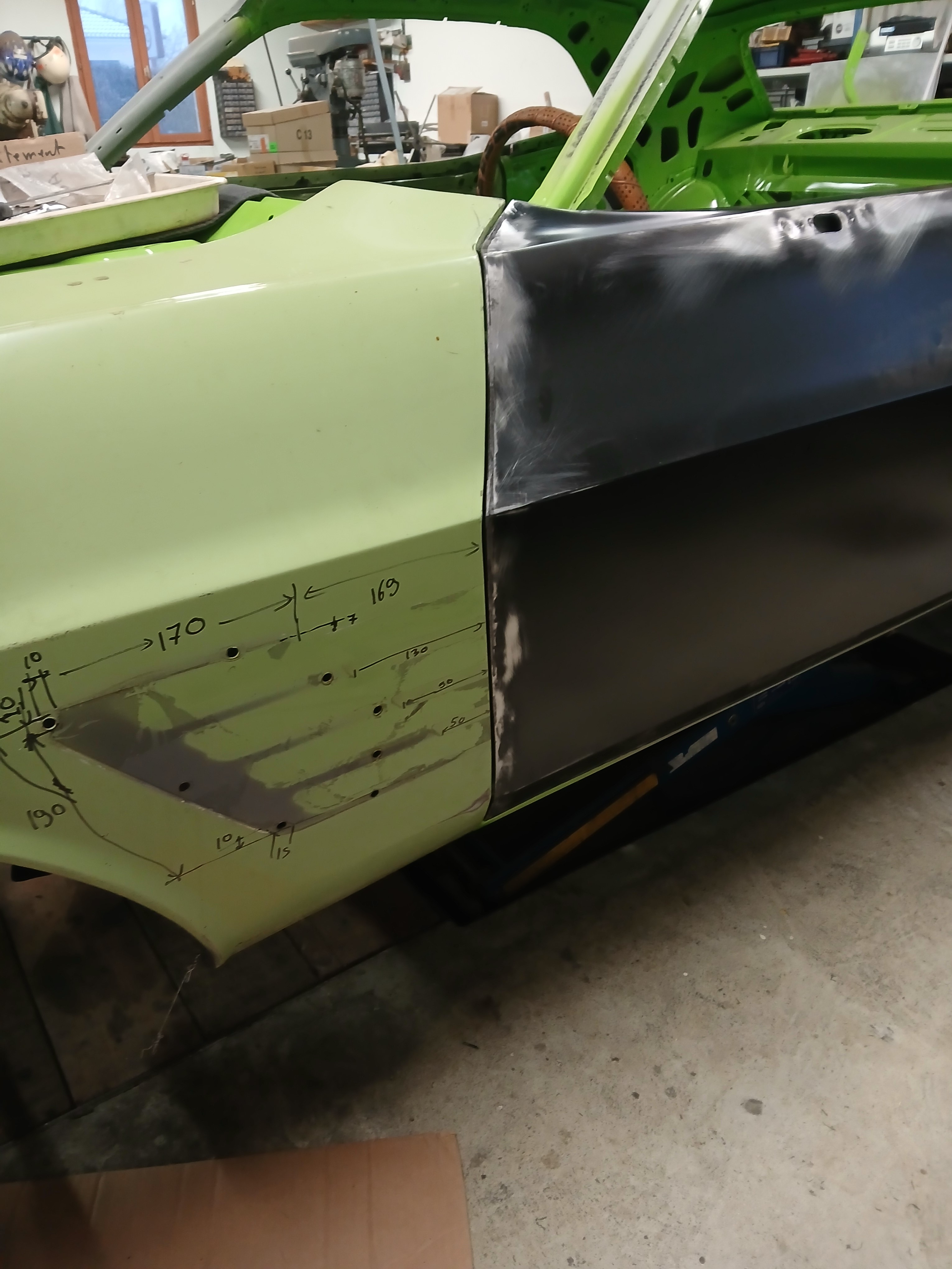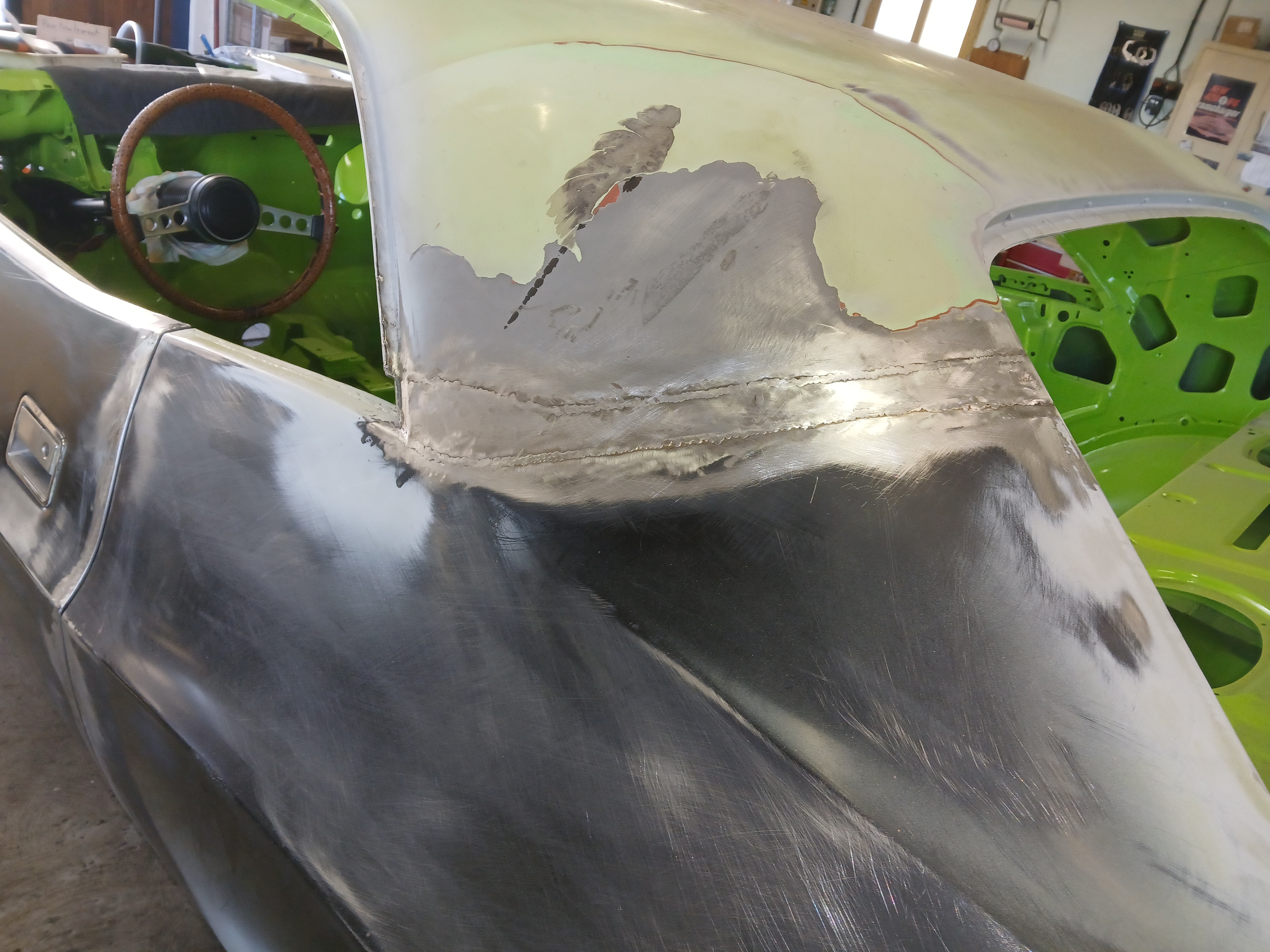 J'ai fini l'alignement des panneaux doté droit , rechargé un peu les arrêtes de portière pour égaliser les jours , et fait quelques patch par-çi par-là ... un vilain trou rempli de mastic