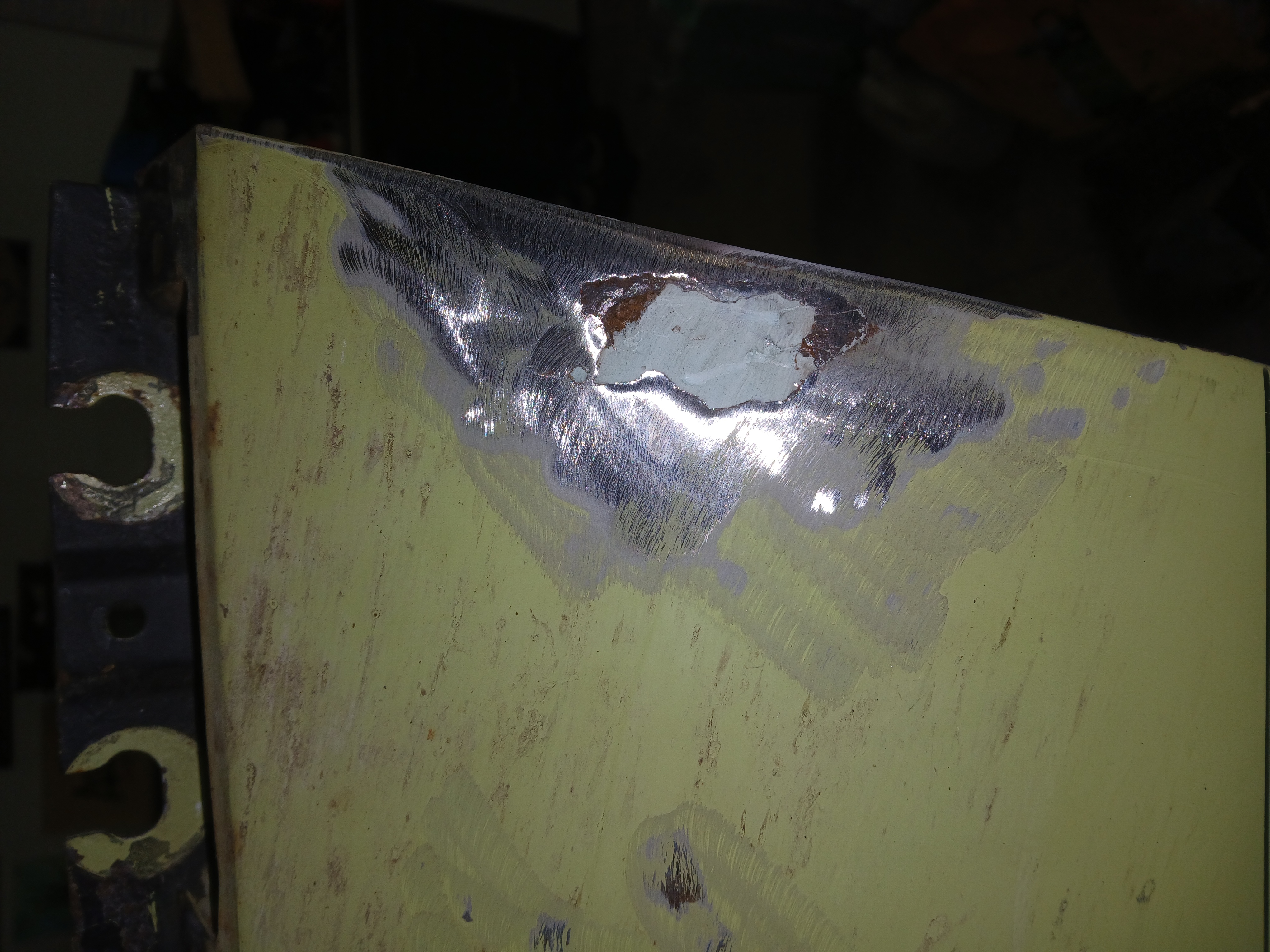 Soudure d'une baguette pour refaire l'arrête. Ajustement de la baguette au profil de la porte. Découpe et soudure du panneau sur la baguette. un coup de disqueuse pour effacer les soudures. pareil pour la partie basse. un dernier coup pour finir puis reglage du jour de la porte C'est pas super , mais je suis plutôt satisfait