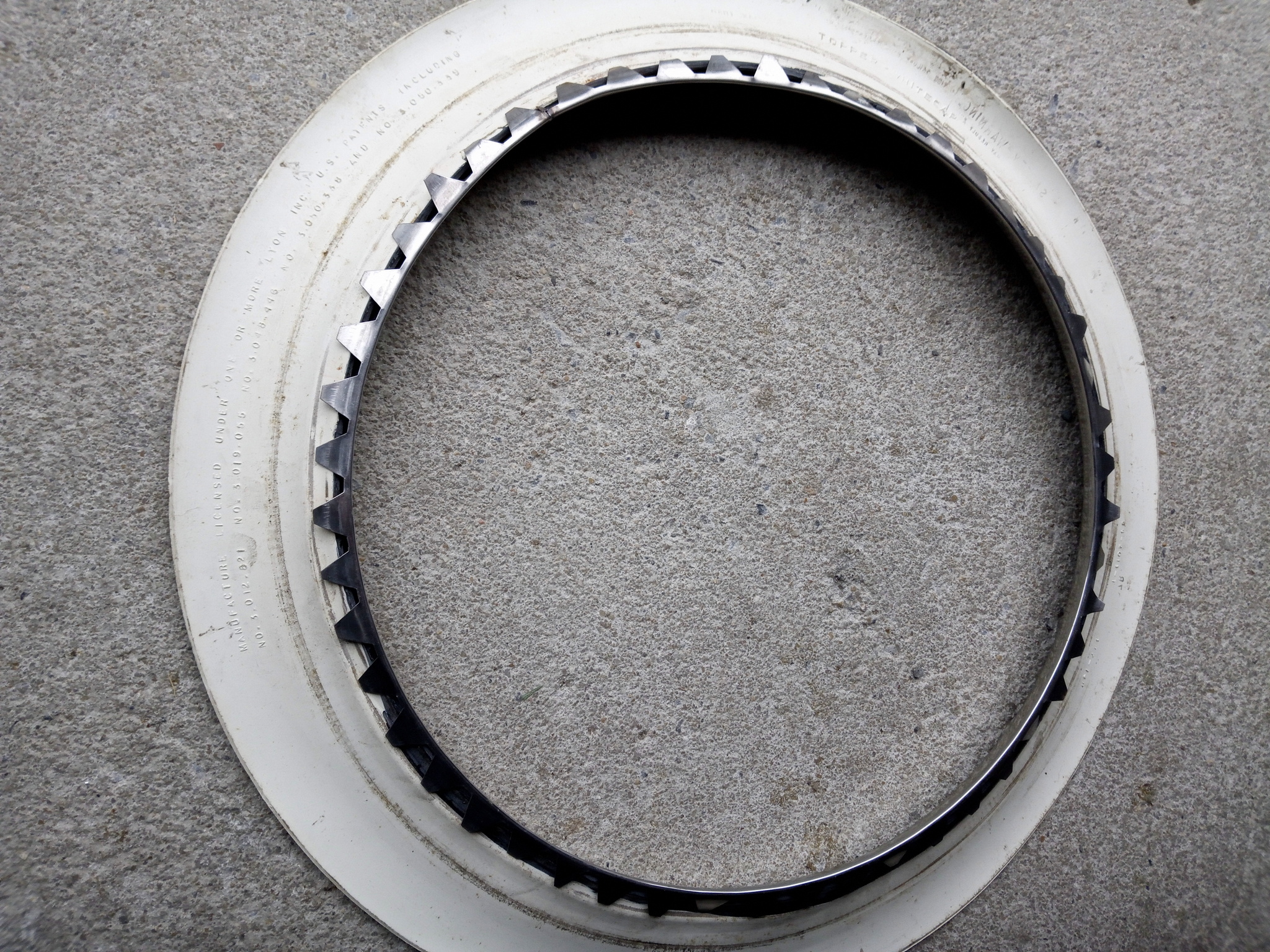 alors en effet, ils ne sont pas entre la jante et le pneu, ils sont fixés sur le cerclage chromé qui est fixé sur la jante, le proprio m'en a fourni deux de rechange, ce qui m'a permis de bien voir, donc ils sont juste clipés par la forme des dents métalliques, j'ai juste à y aller comme un bourrin pour les déclipser ??