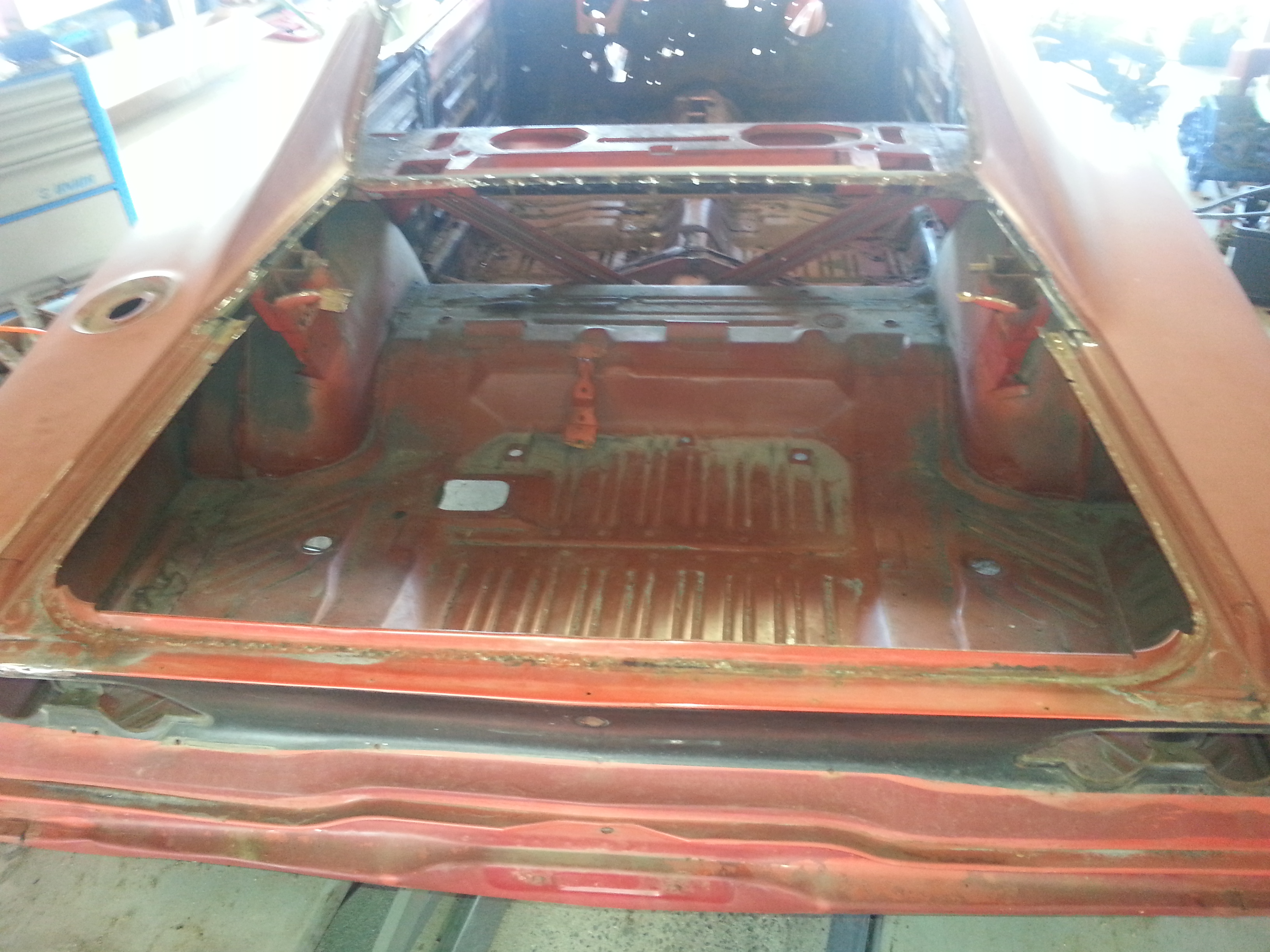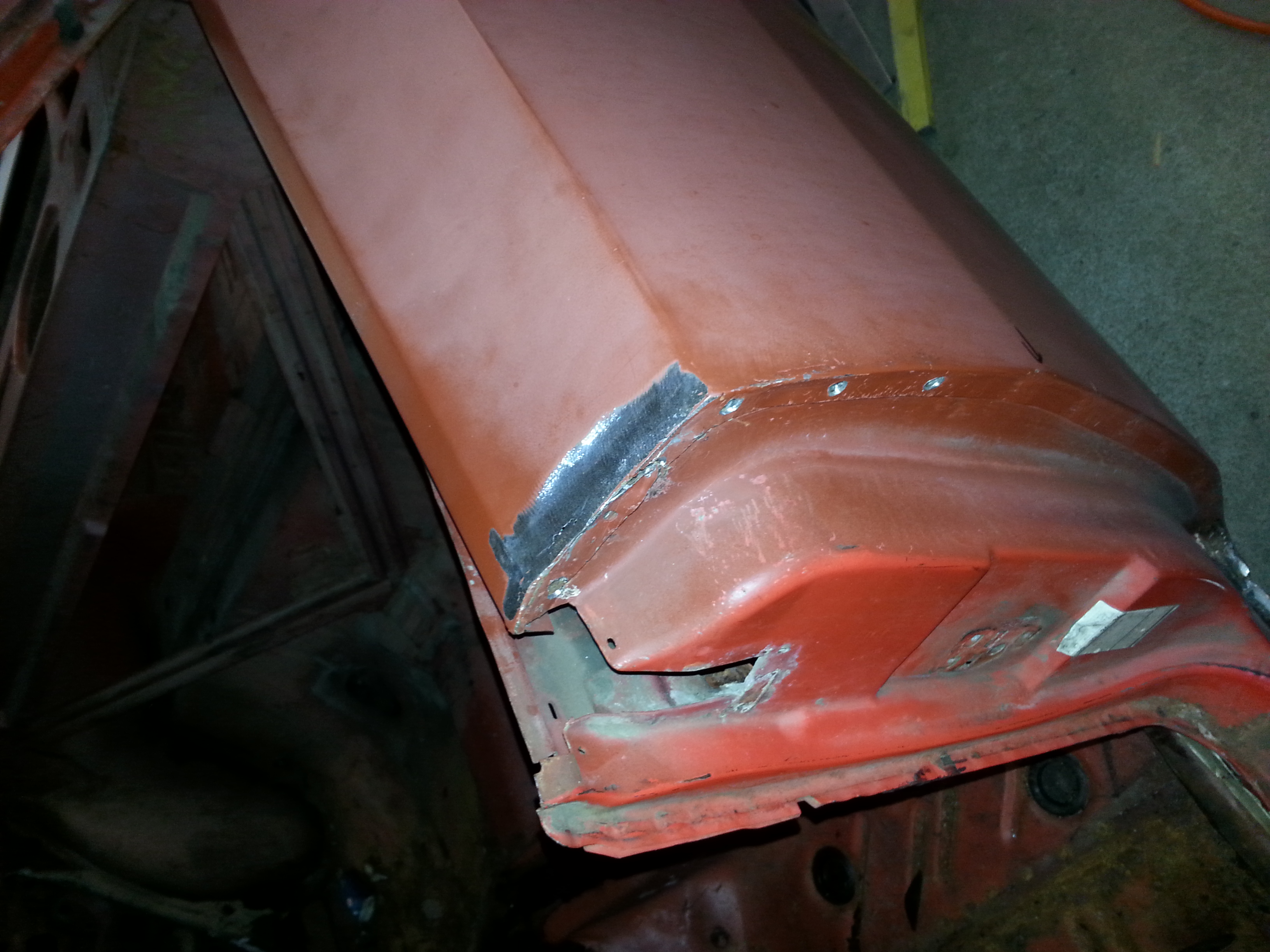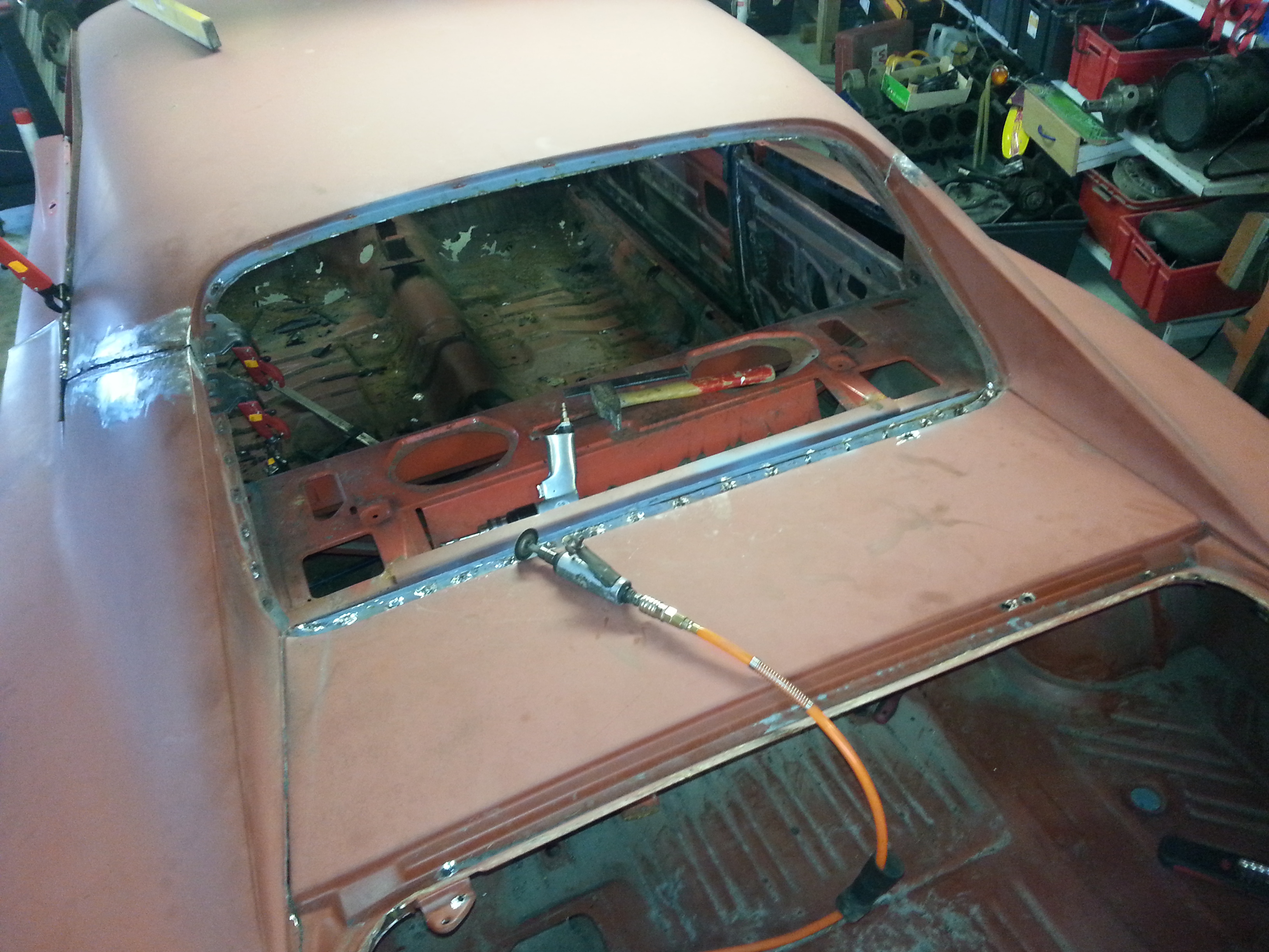 Donc il faut tout reprendre. Déssouder les ailes au niveau de la jonction avec le pavillon, aussi au niveau de la lunette arrière et des portes avant. Dépointer et déposer entièrement la plage arrière.