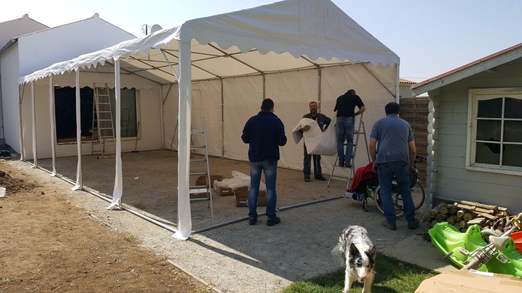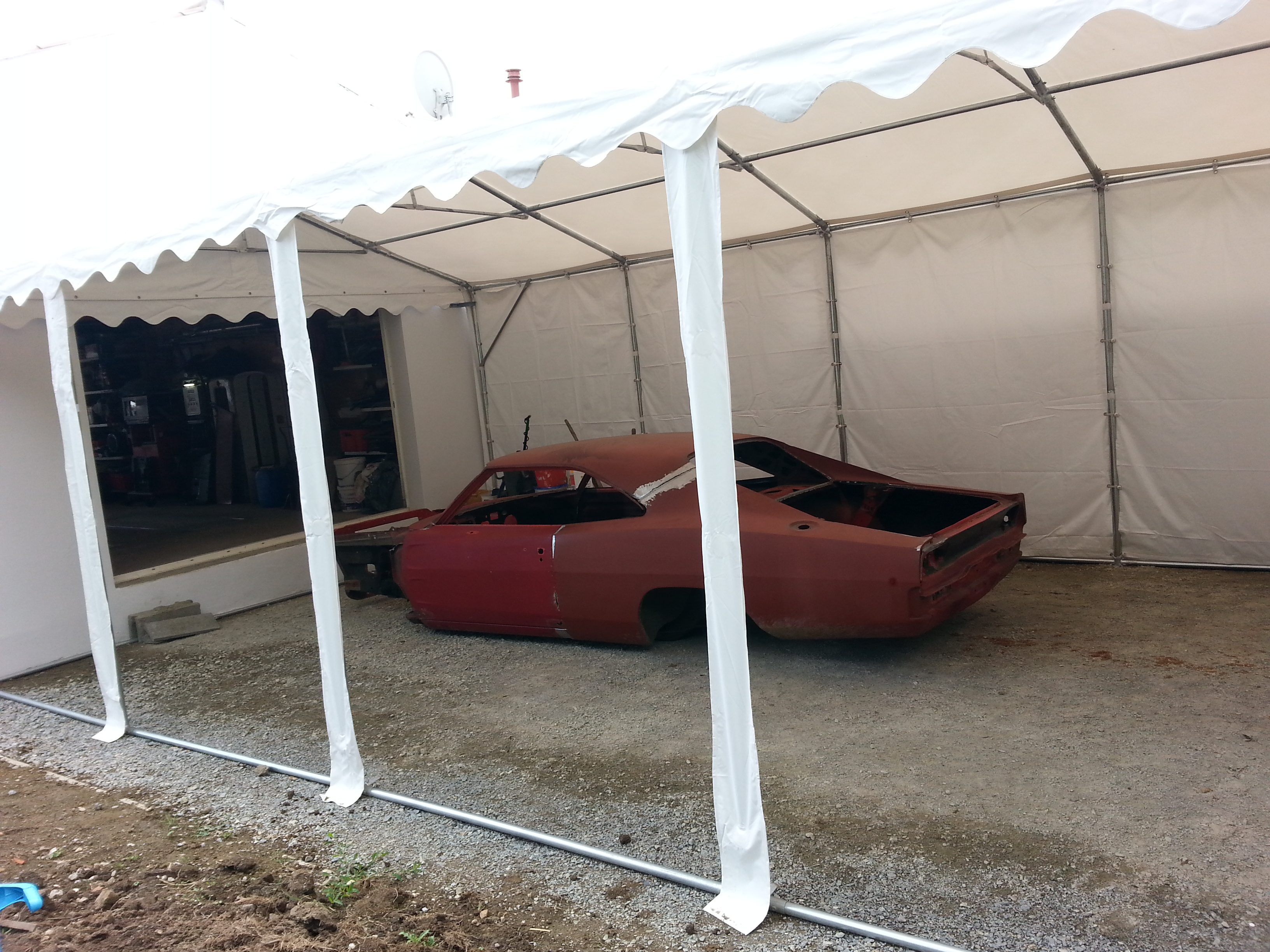 Afin de ne pas pourrir tout mon garage avec les travaux se meulage, sablage et peinture, mes beauf' des potes et moi avons installé une tente de stockage à l’arrière du garage. Ce week-end, on a déplacé la caisse dedans et la semaine prochaine on la monte sur une rôtissoire.