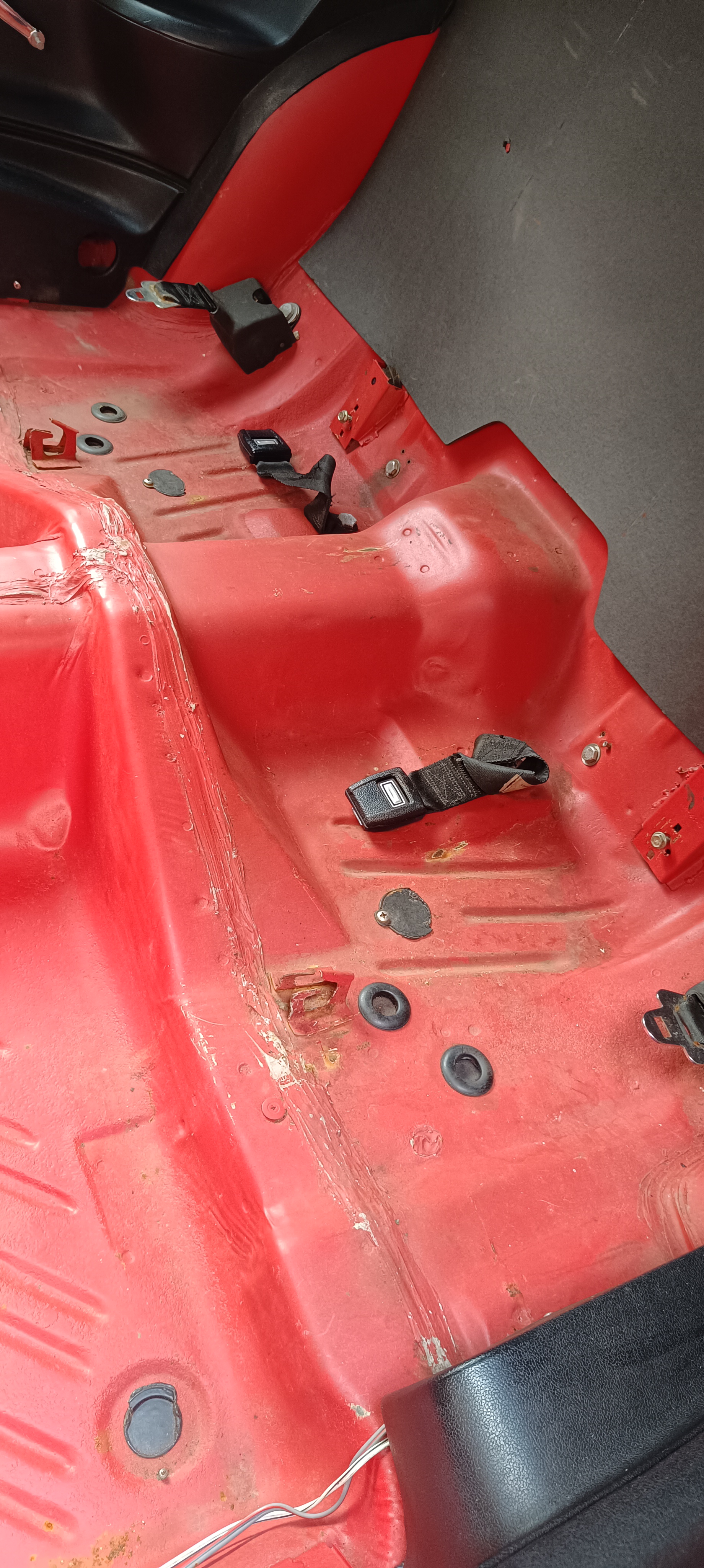Alors quelques petites photos , démontage intérieur, plancher très propre niveau rouille ( justes quelques traces d'eau ), des crottes sous la moquette et dans les banquettes mais rien de bouffé ( ni fil, ni mousse )