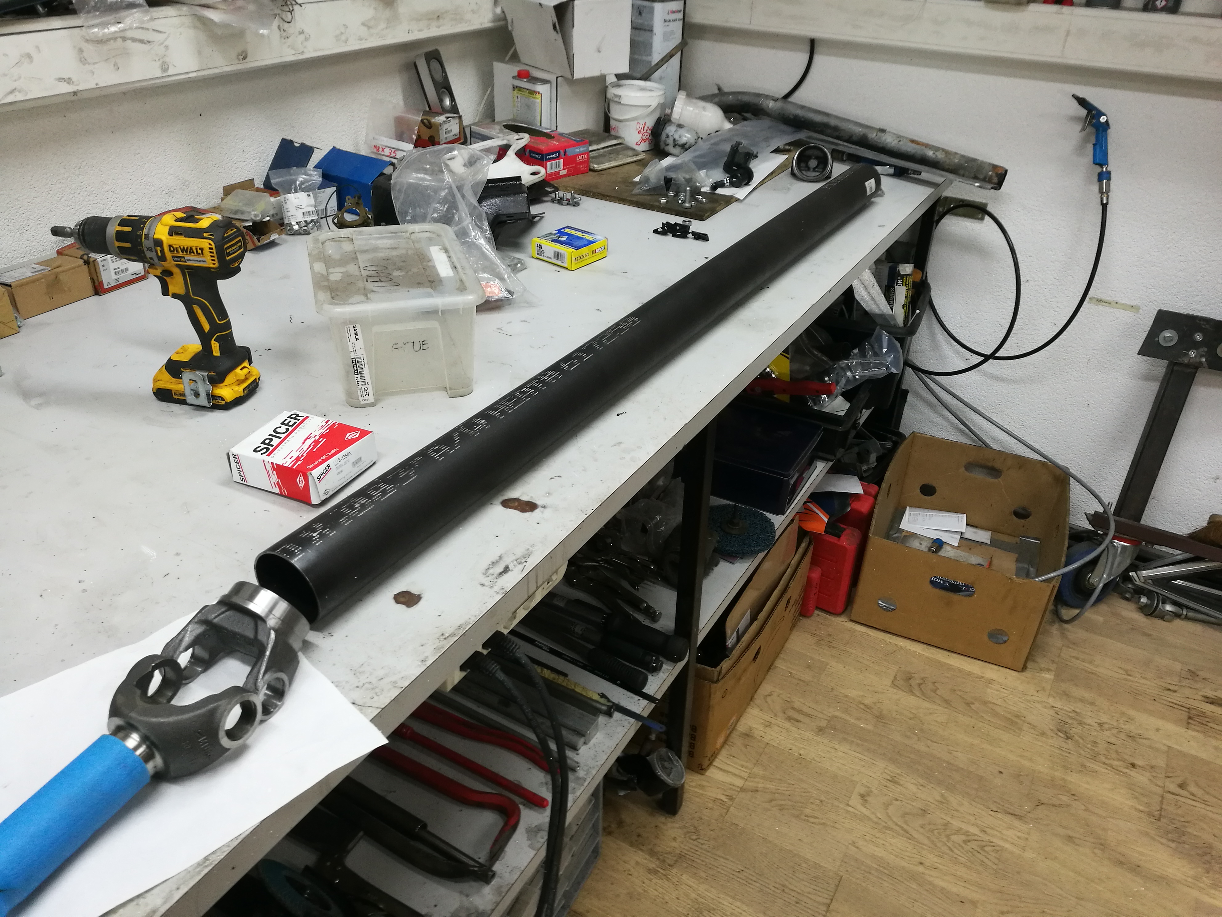 J'ai du faire un arbre de transmission sur mesure. En effet il fallait adapter les yokes disponibles sur la T-56 ainsi que le pont mopar et la longueur. J'ai fait ça @ home. J'essaierai de fair un équilibrage dynamique avec la méthode du verre d'eau. Car en suisse un équilibrage c'est un bon 300€...