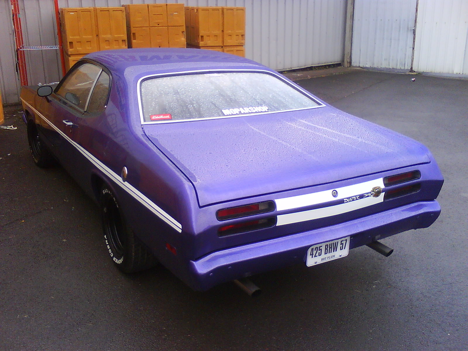 J'ai un peu laissé de côté le forum et pour ceux qui ont connu ma monture... C'était une Duster 70 restaurée en couleur plum crazy. Une fois les travaux finis, j'ai eu la bonne idée de la vendre à un amateur d'américaines qui l'a personnalisée à l'aide de lettrage adhésif et de logos trouvés dans les vieux stocks de chez feu vert et norauto. Bref: un massacre. Je crois que depuis elle a un peu voyagé vers le sud de la France... Et j'espère que son propriétaire actuel en prend soin.