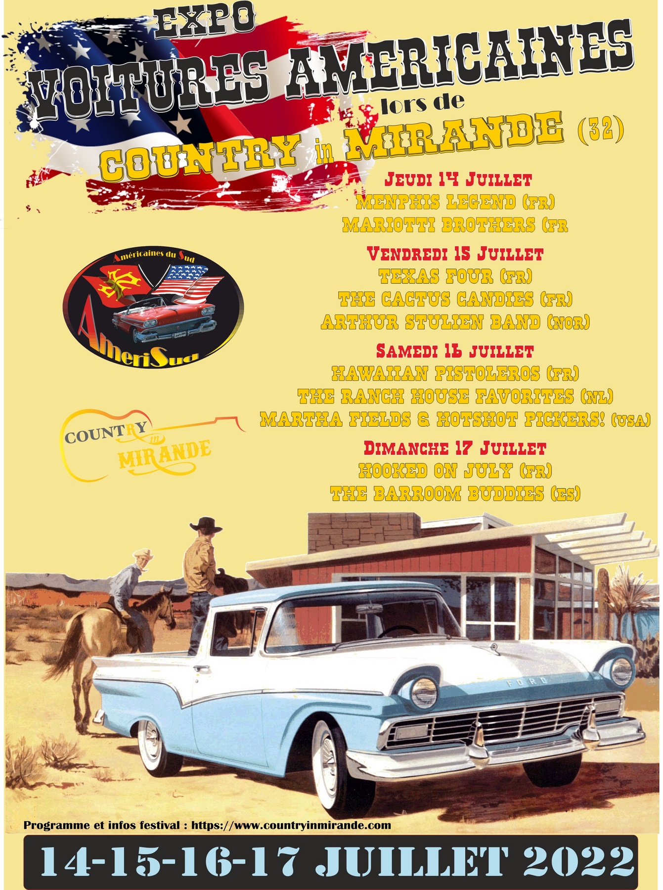 Le club AmeriSud est partenaire de Country In Mirande et s'occupe de l'expo de voitures US qui déménage à l'entrée du Festival, sur le parking de la salle Beaudran.