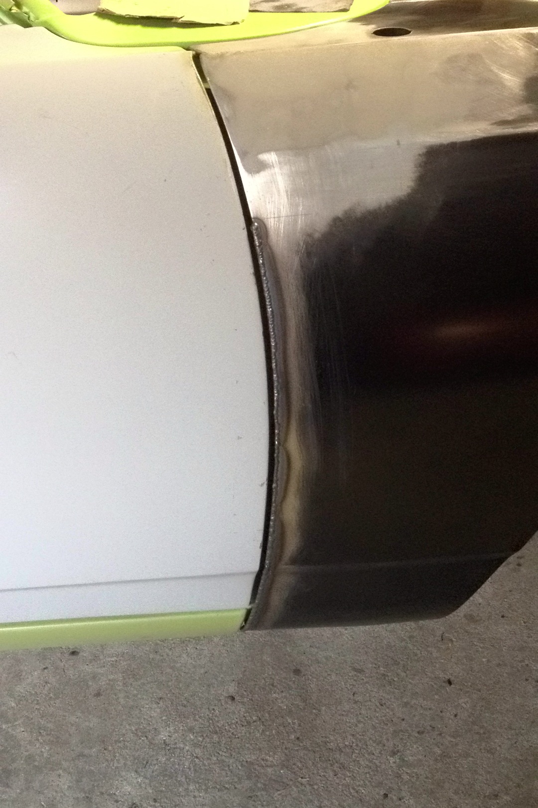 En fait, le galbe de l'aile ne suivait pas celui de la porte passager, en exagérant on pouvait passer la main etre la porte et l'aile et touché l'intérieur de l'aile en gros (je caricature bien sur). Au niveau du renfort de l'aile celui qui part d'en haut et qui redescend au niveau de la fixation sur le bas de caisse on s'est aperçu que la peau de l'aile était soudée plus en retrait que celle d'origine. Du coup on a dessoudé la peau du renfort en bas tirée dessus et ressoudé. Après ça le galbe de l'aile suivit bien celui de la porte. MAis ce n'est pas finit lol