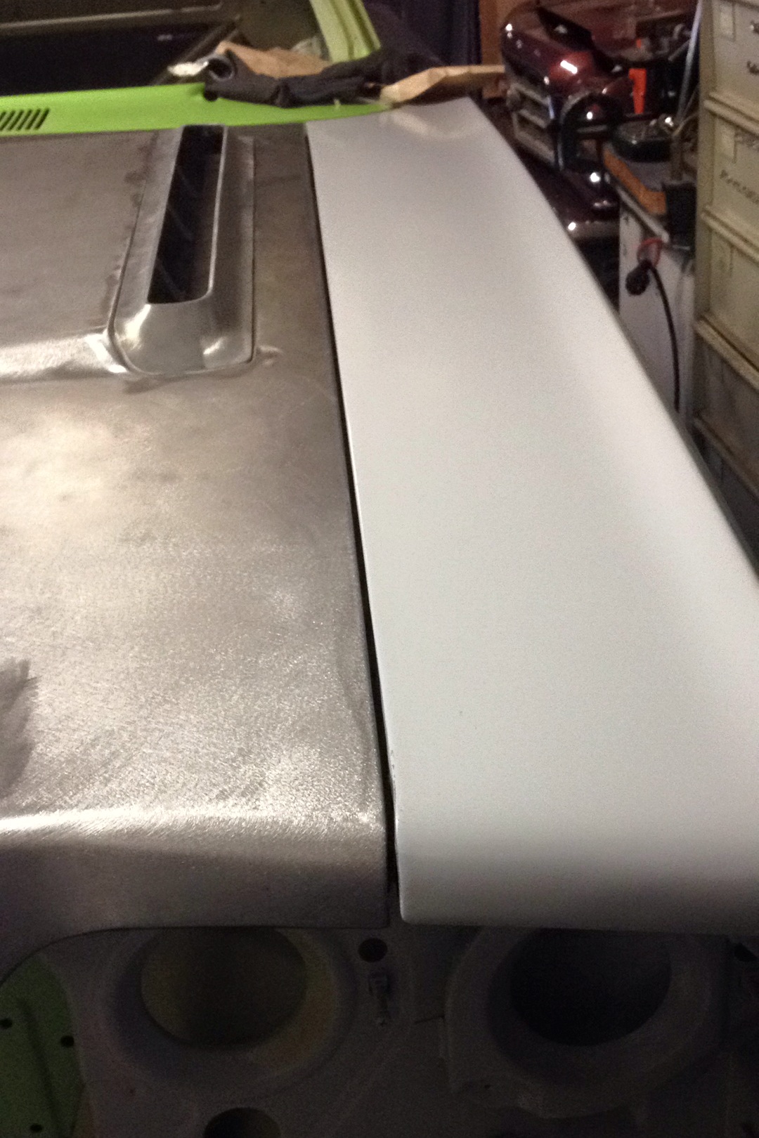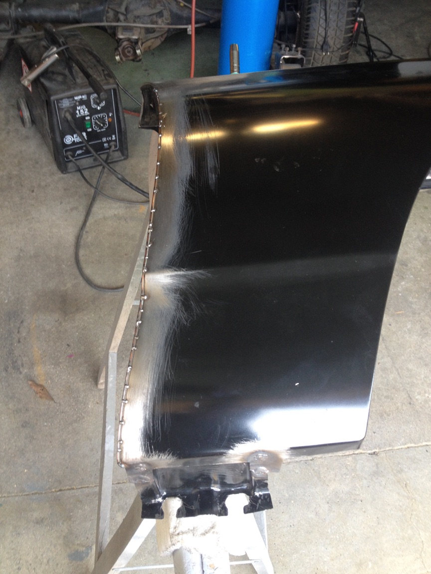 cette baguette on va s'en servir pour faire une "extension' d'aile. On l'a placé sur l'arête de l'aile, puis pointée en ajustant l'écart en fonction de la taille du gap avec la porte. ensuite finir le soudage et meulage.