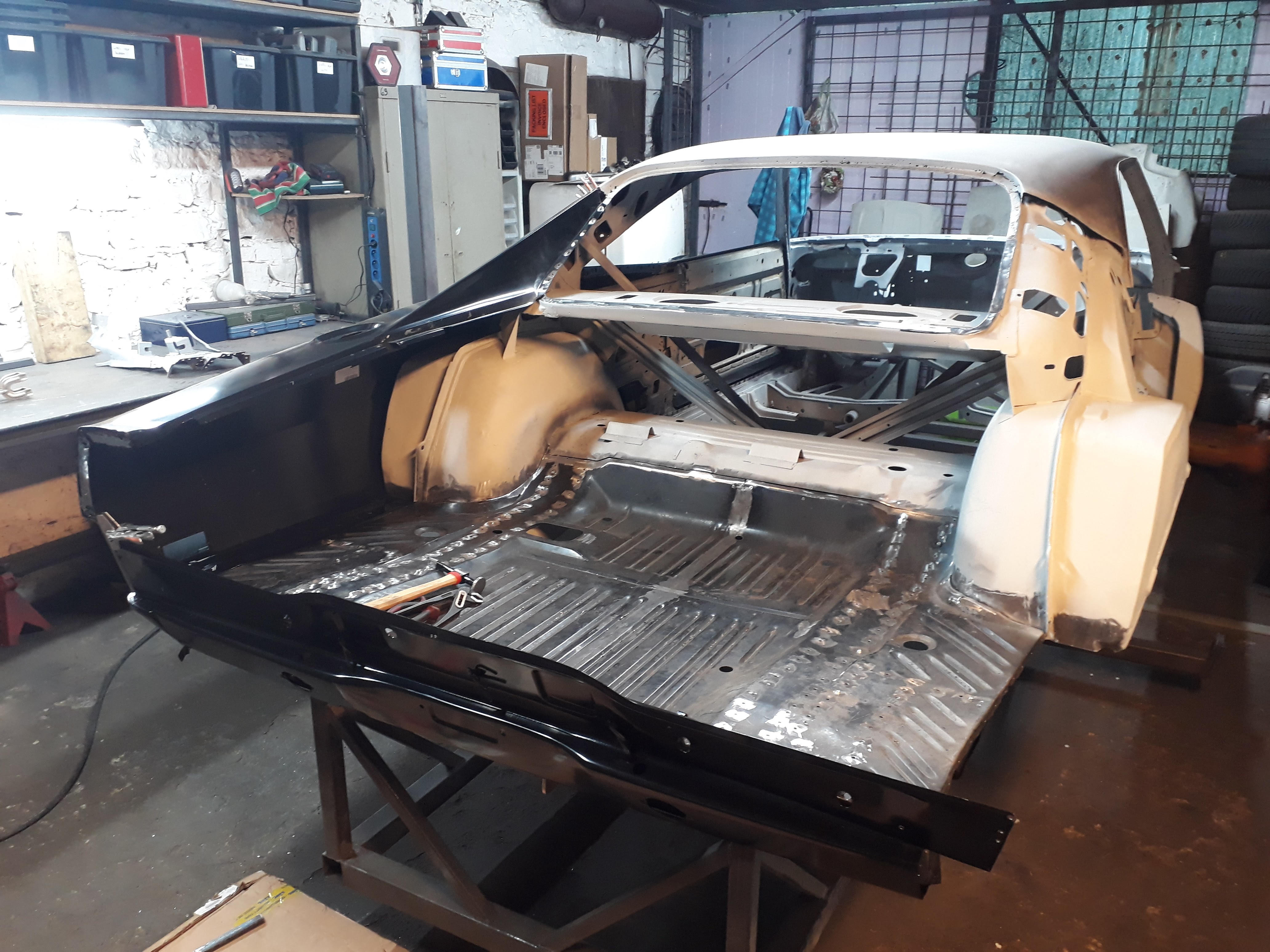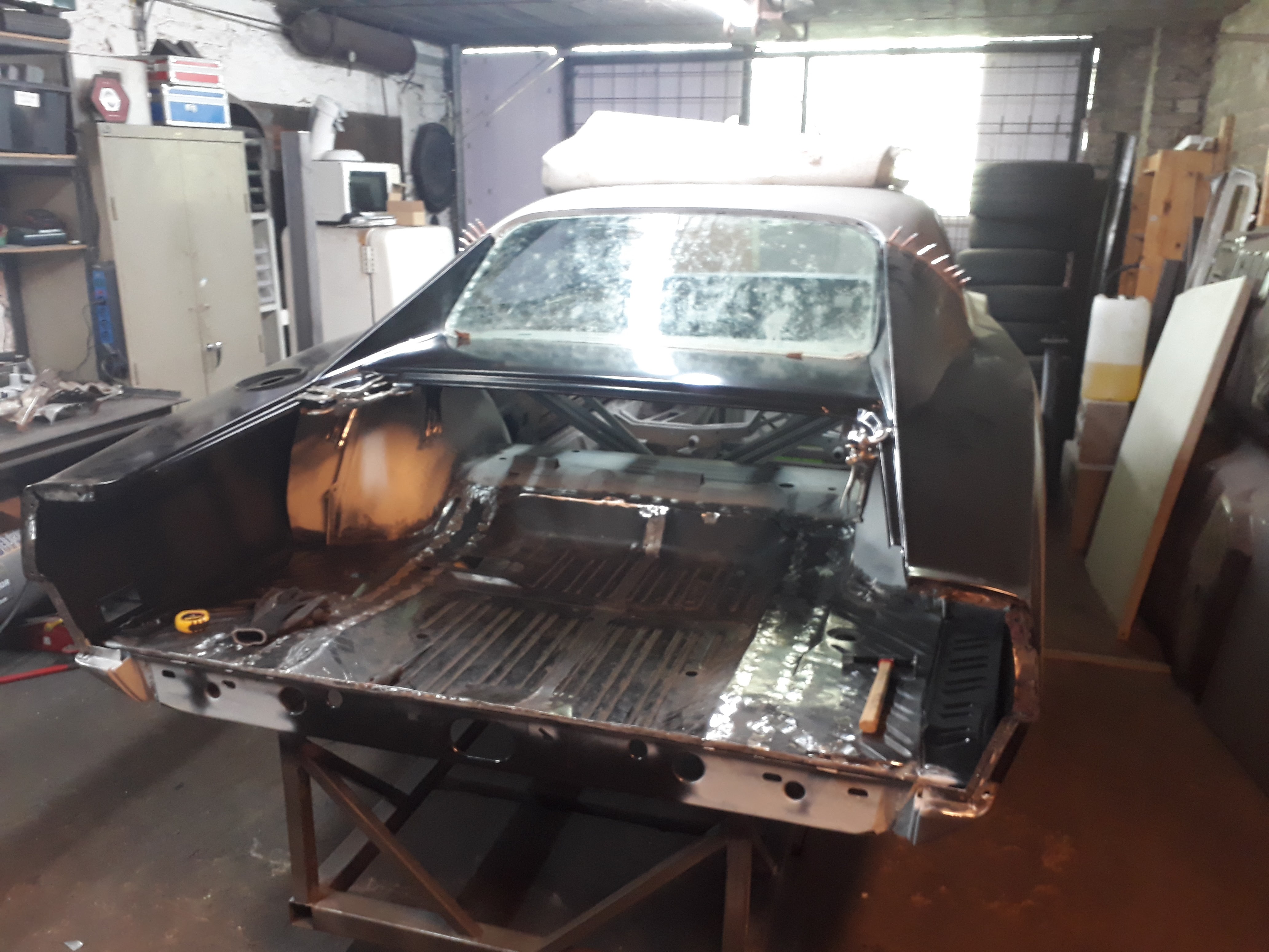 Soudure du plancher, des extensions de plancher, bas d'aile, tours de pare brise (petit risque ici parce que je n'ai pas les moulures de vitre :whistle: ), deck lid filler panel, je replace les support de charnière de la malle ( qu'il a fallu modifier, bah oui ils vont sur les passage de roues qui ont été... modifiés :lol: ) ... Je jette la caisse sur le flanc pour les soudure des dessous :