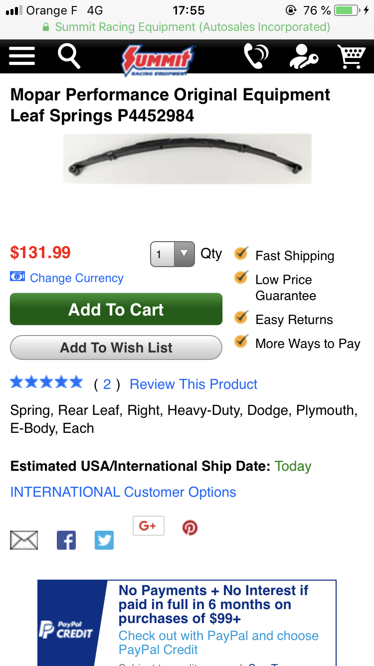J'ai commandé il y a deux jours des Mopar Performance XHD (équivalent à ce qui était monté sur les 446 et 440) C'est moins raide que du Hotchkiss mais mieux que ce qu'on a d'origine. (C'est ce que j'ai lu sur les forums US en tout cas)