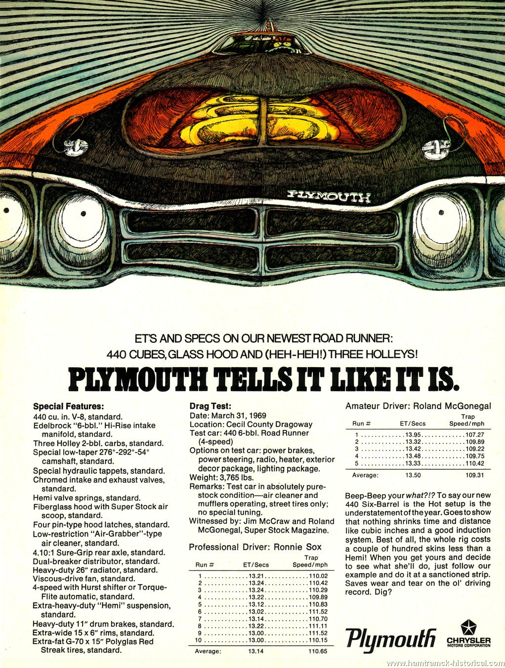 C'est tout simplement une publicité du constructeur, Plymouth, et de sa maison mère , Chrysler, ils savaient délirer en ce temps-là, et bien heureusement ils le savent toujours, il n'y a qu'à voir la Demon déjà plus produite, et le moteur que l'on pourra acheter au comptoir de sa concession préférée, le crate 426 Hemi "Hellephant" , 1000 cv a installer dans ta Mopar préférée !!!