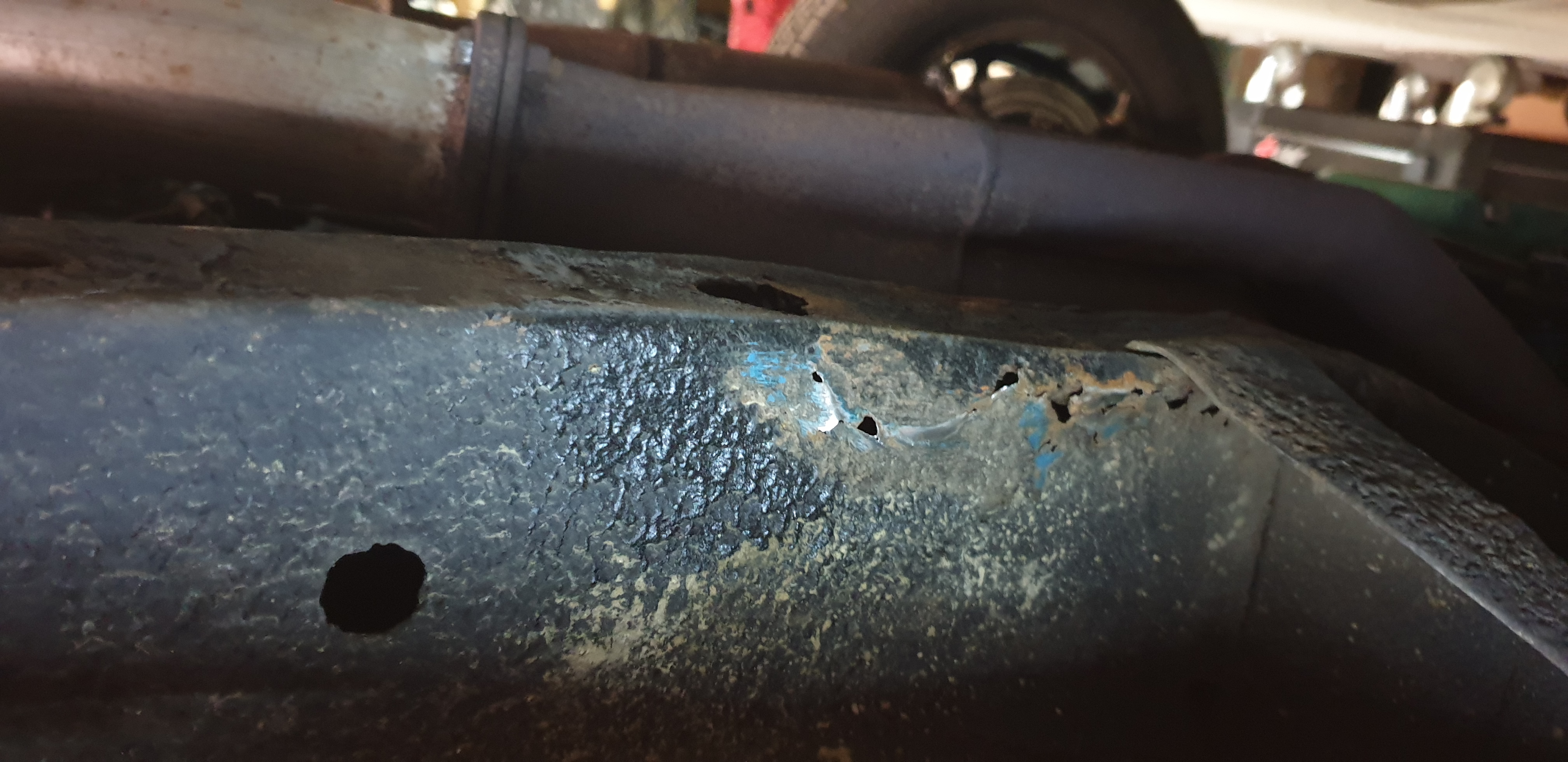 et ... avec la baladeuse led, longeron AV G, de près, je me dis, tiens , l'est pas si joli que ça, de très près, allez hop, brosse métallique sur la perceuse pour virer la merde noir ..