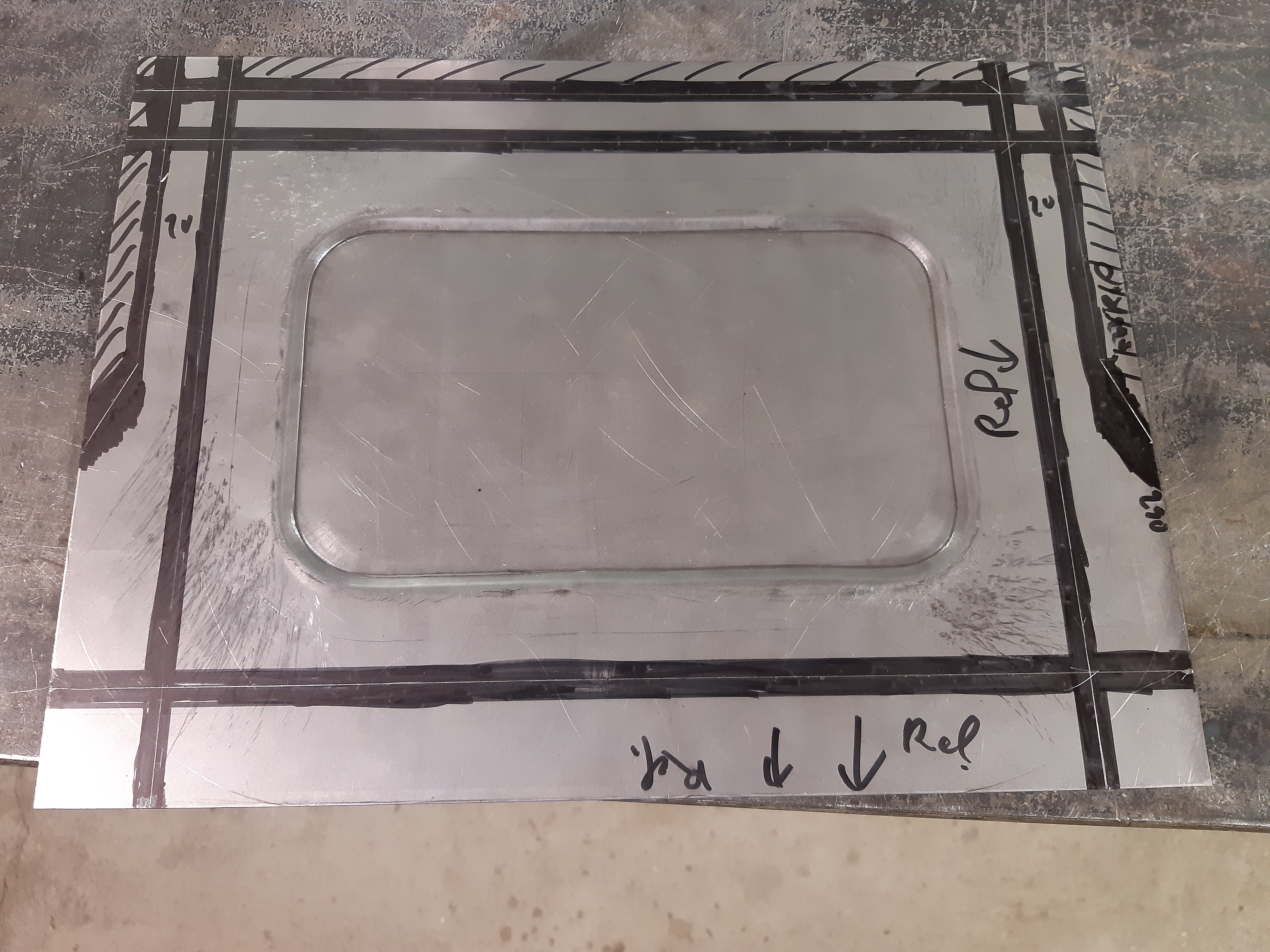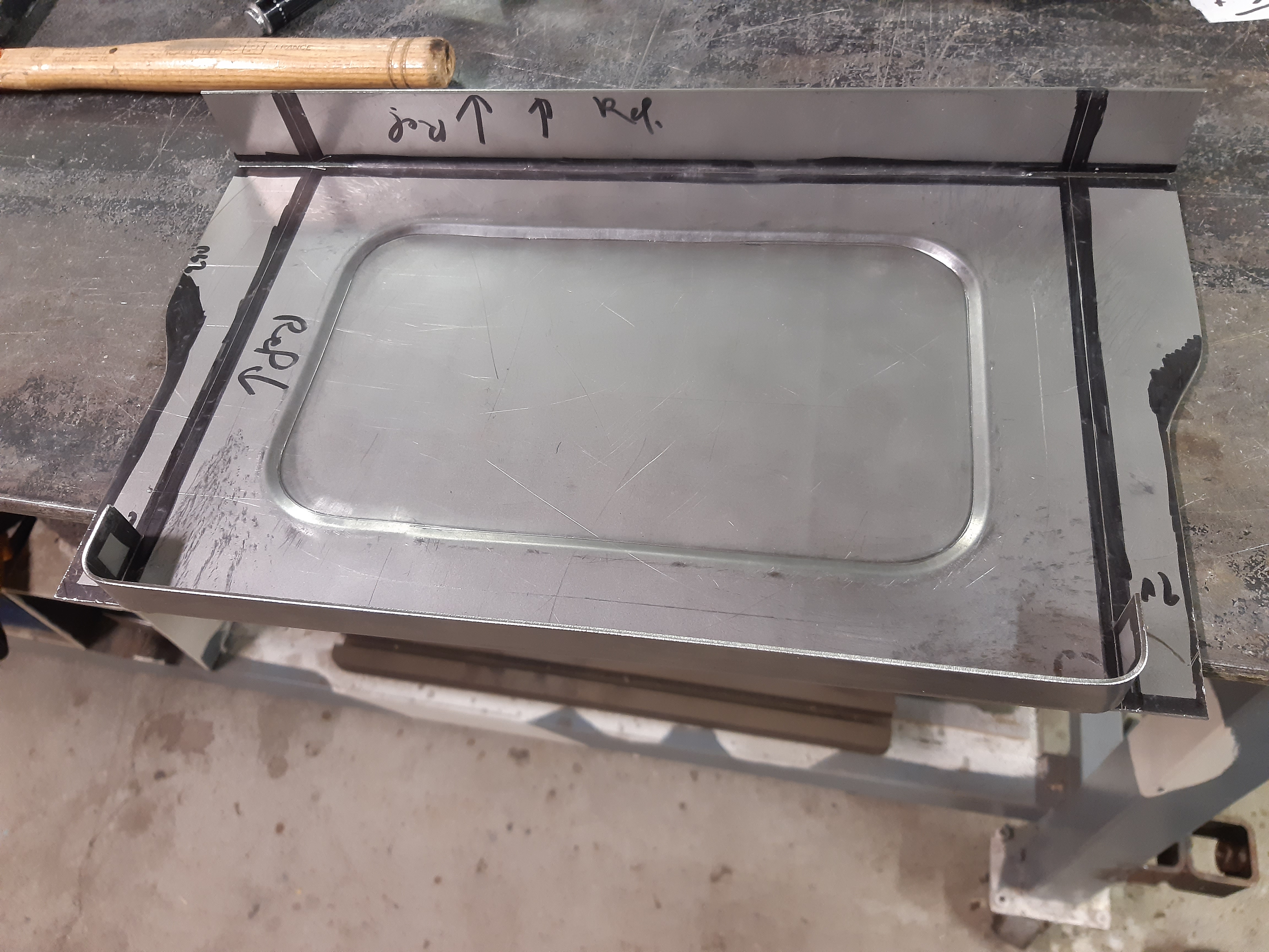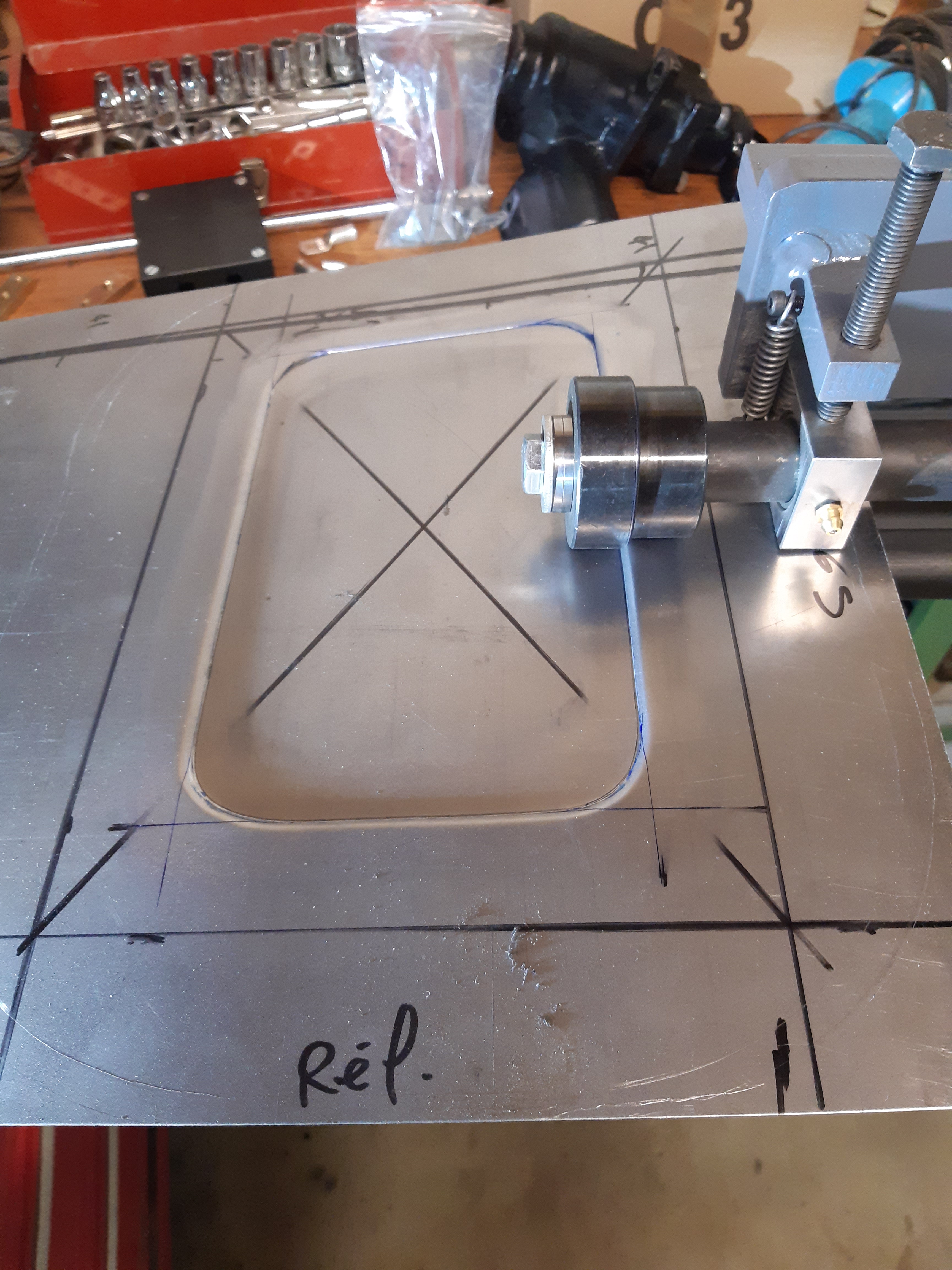 donc , réalisation d'une empreinte afin de donner un peu de nerf à la tôle puis traçage et réalisation des rebords Mais voyant le thermomètre remonter rapidos , j'abandonne tout pour passer une couche de peinture ! en cette saison , 20° c'est pas fréquent !