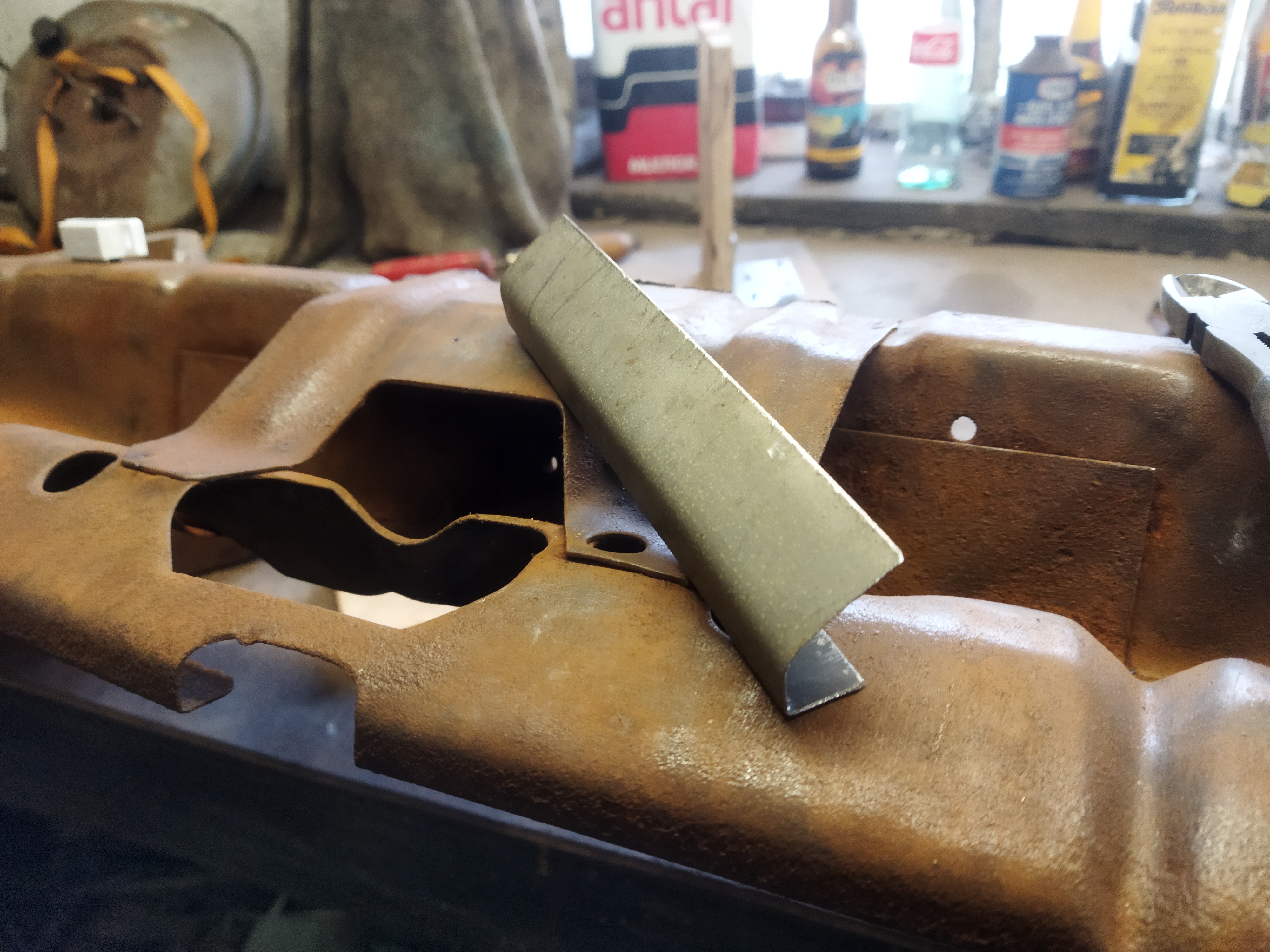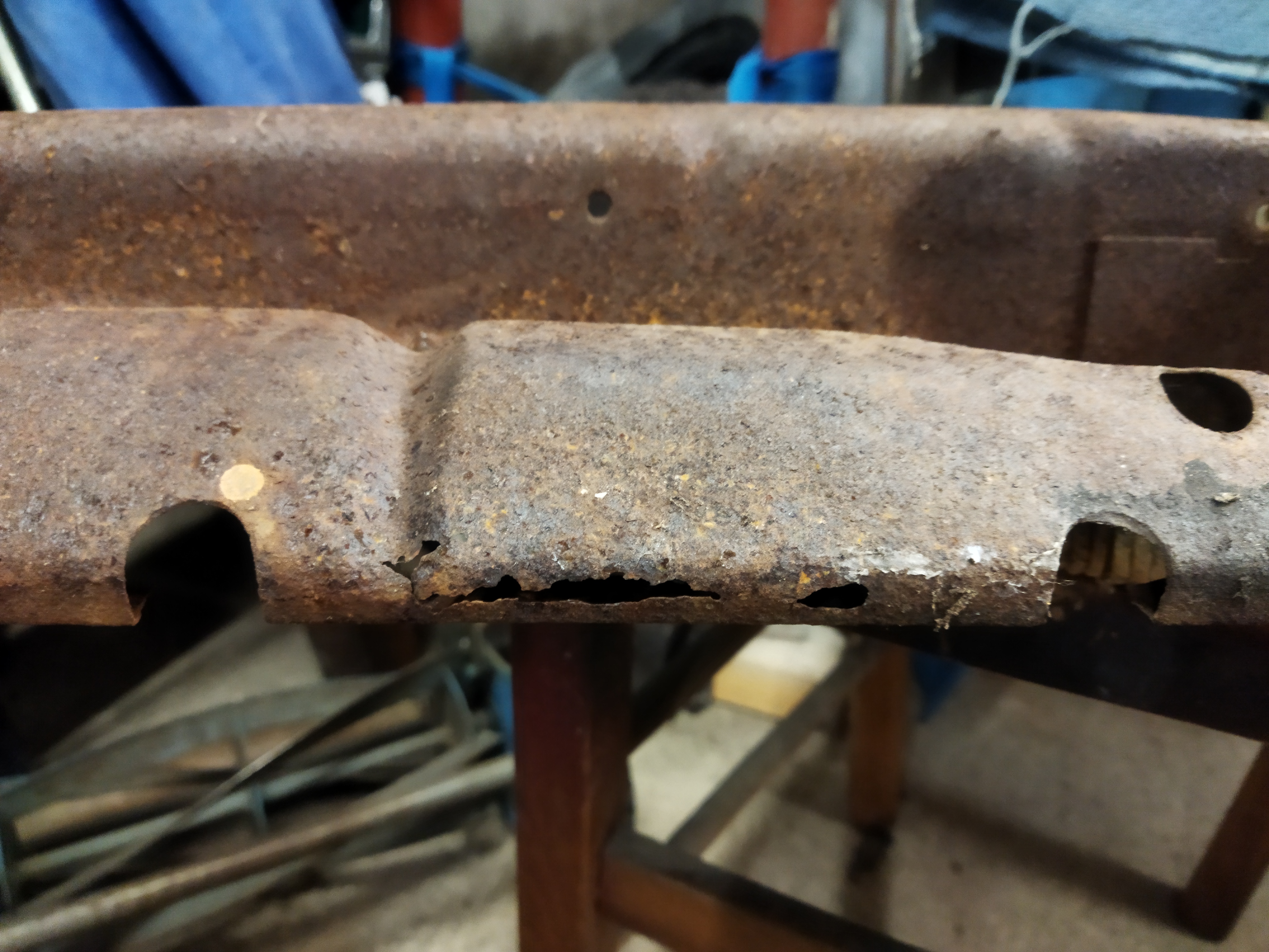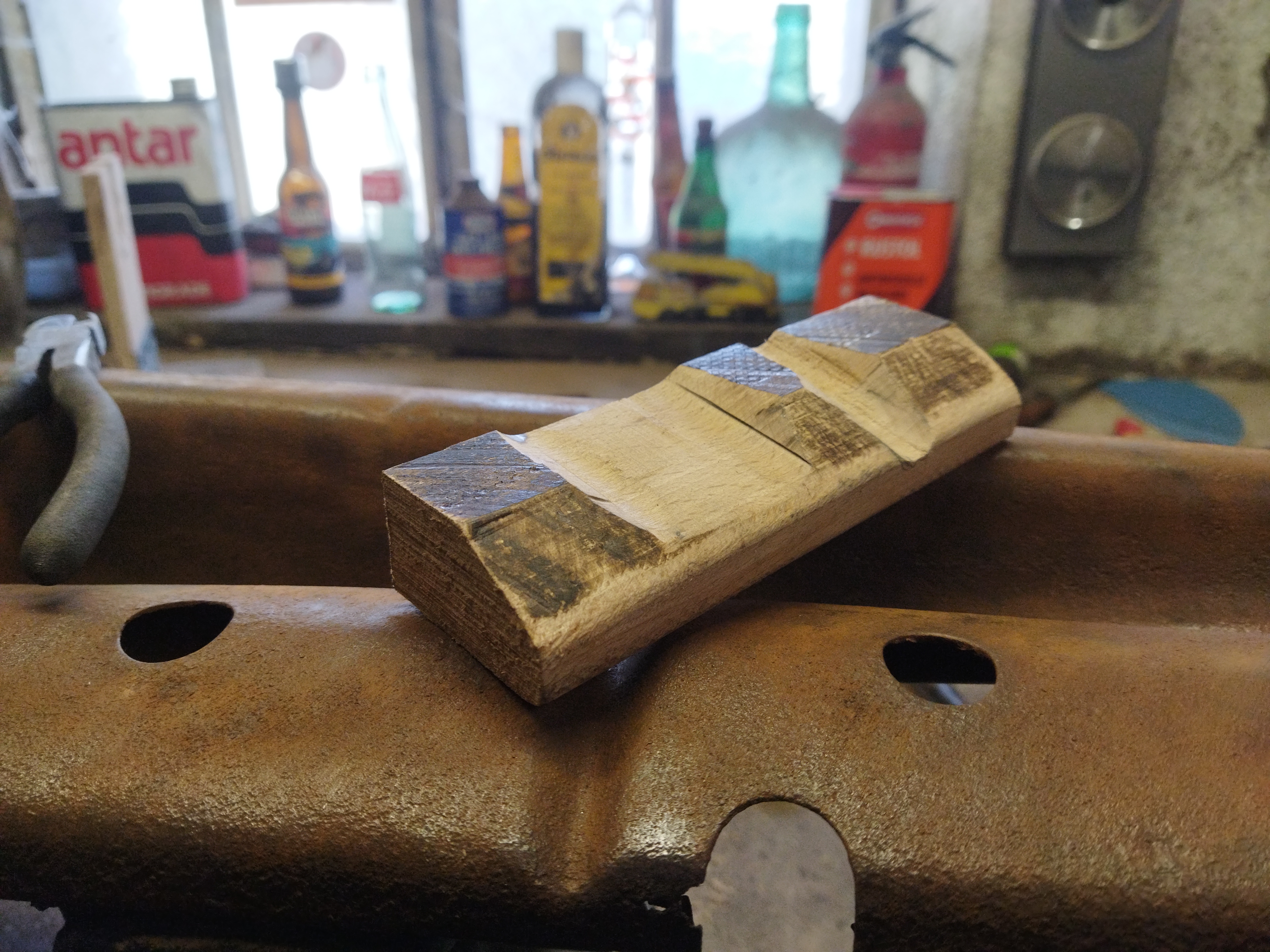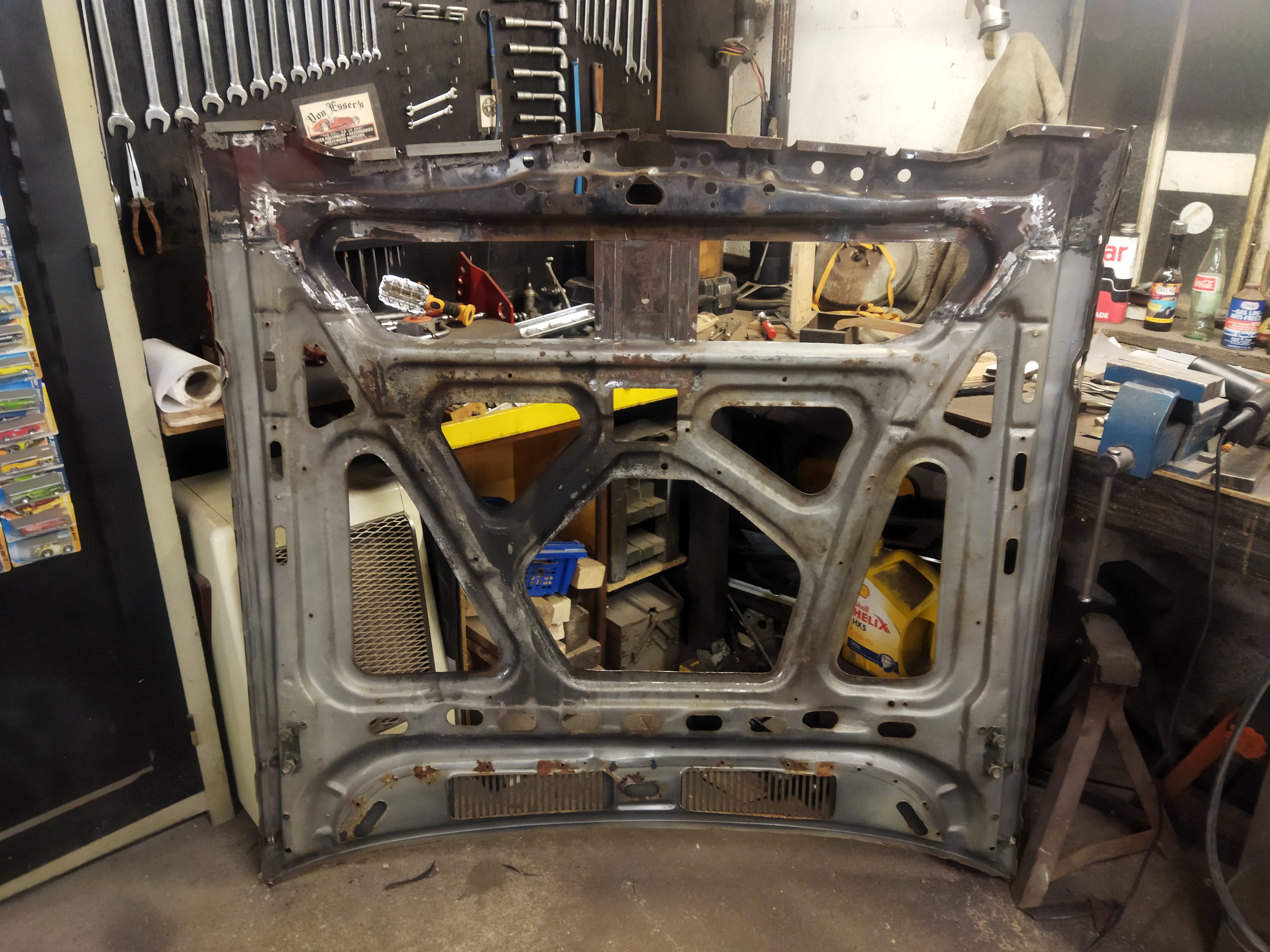 Pour la suite j'ai fait les découpes exacte pour pouvoir souder la peau de capot en bord à bord et j'ai dépointé le renfort avant du capot de Dart, ce qui m'a permis de voir que la rouille avait trouvée refuge dans les petits coins, donc je fabrique une matrice en bois afin de reproduire les formes et c'est parti pour découpage, formage et soudure afin de réparer cette traverse