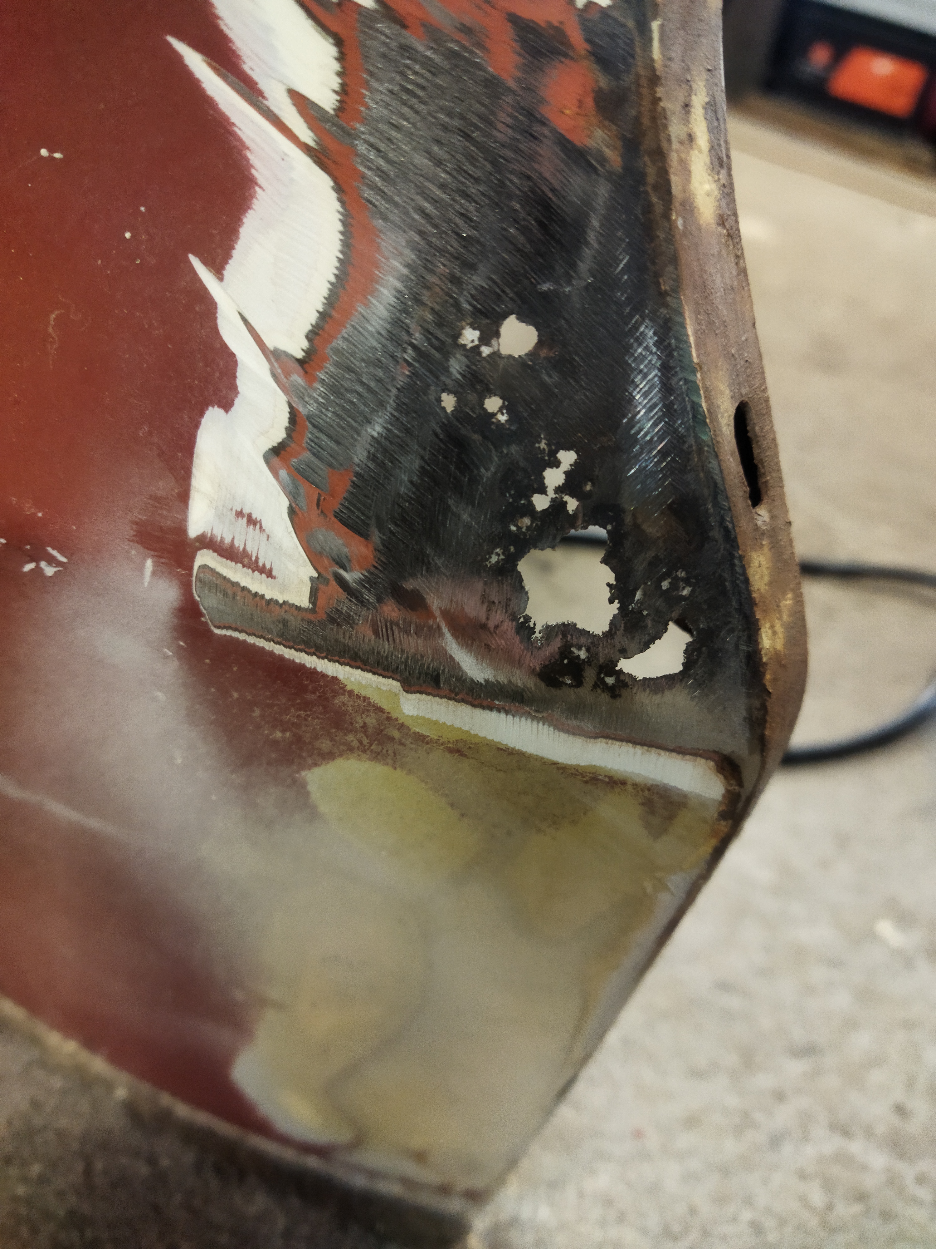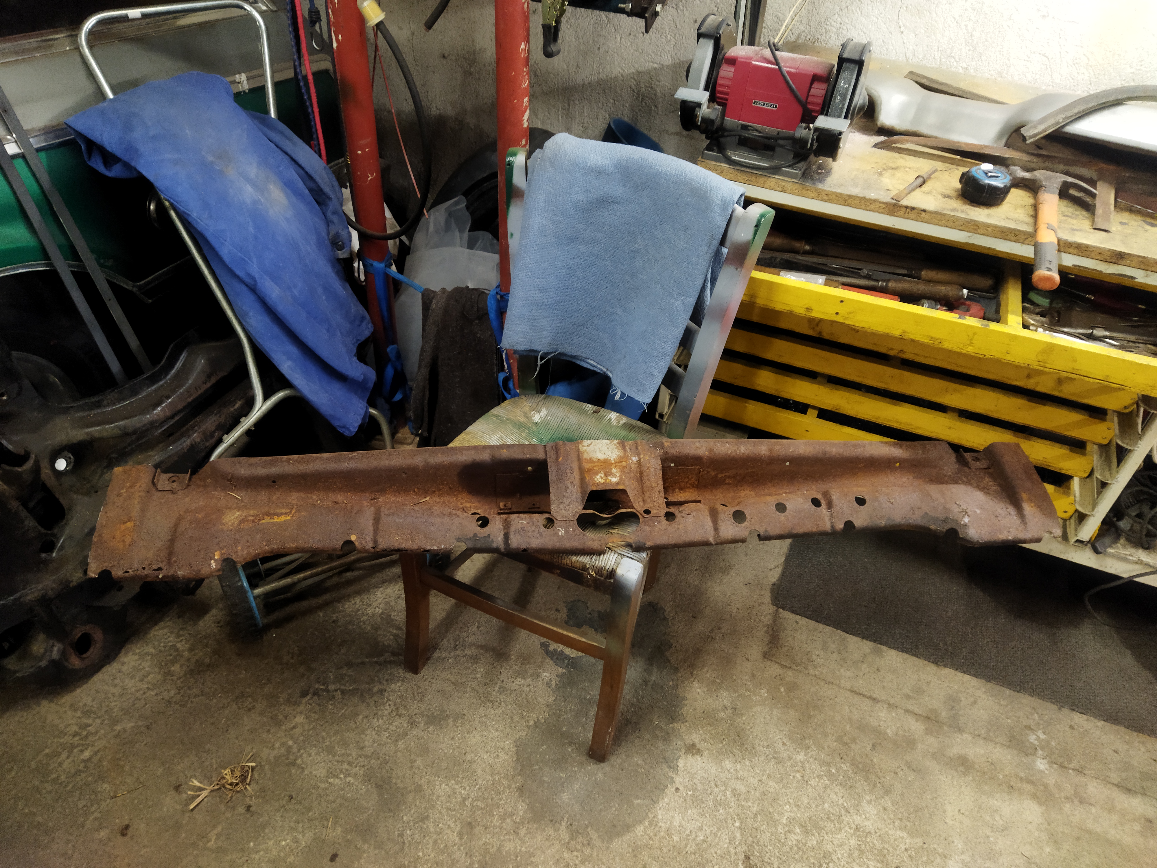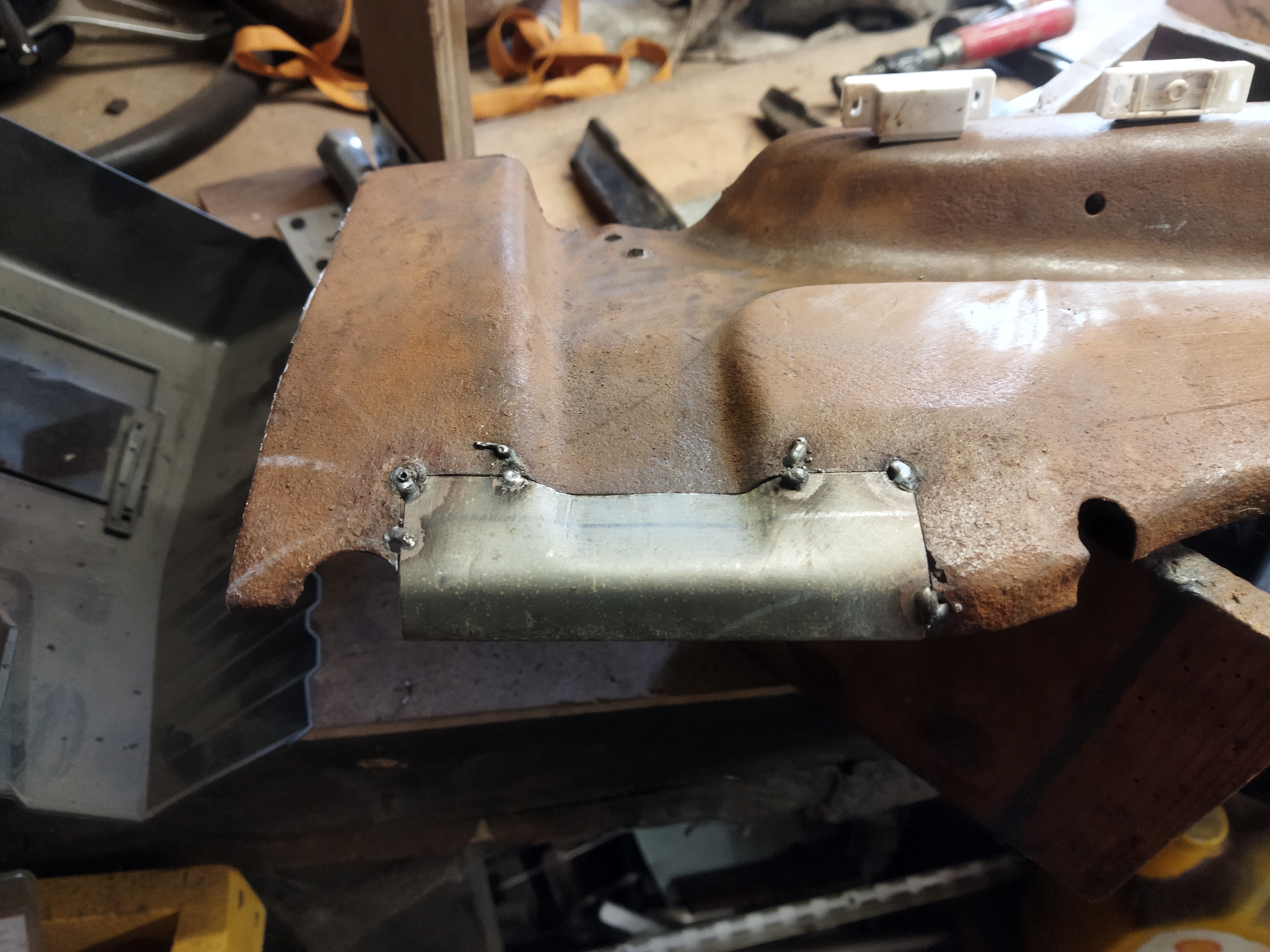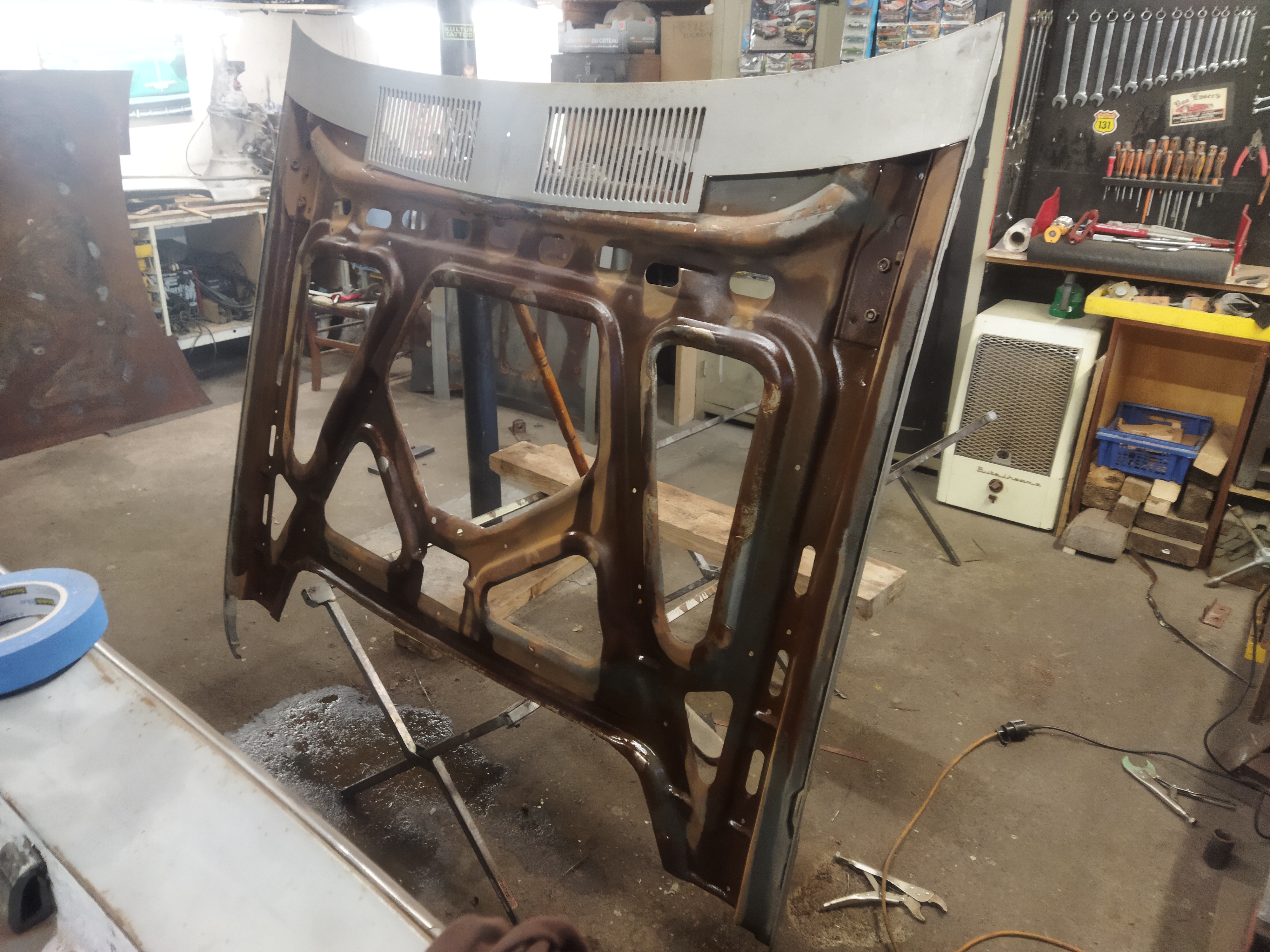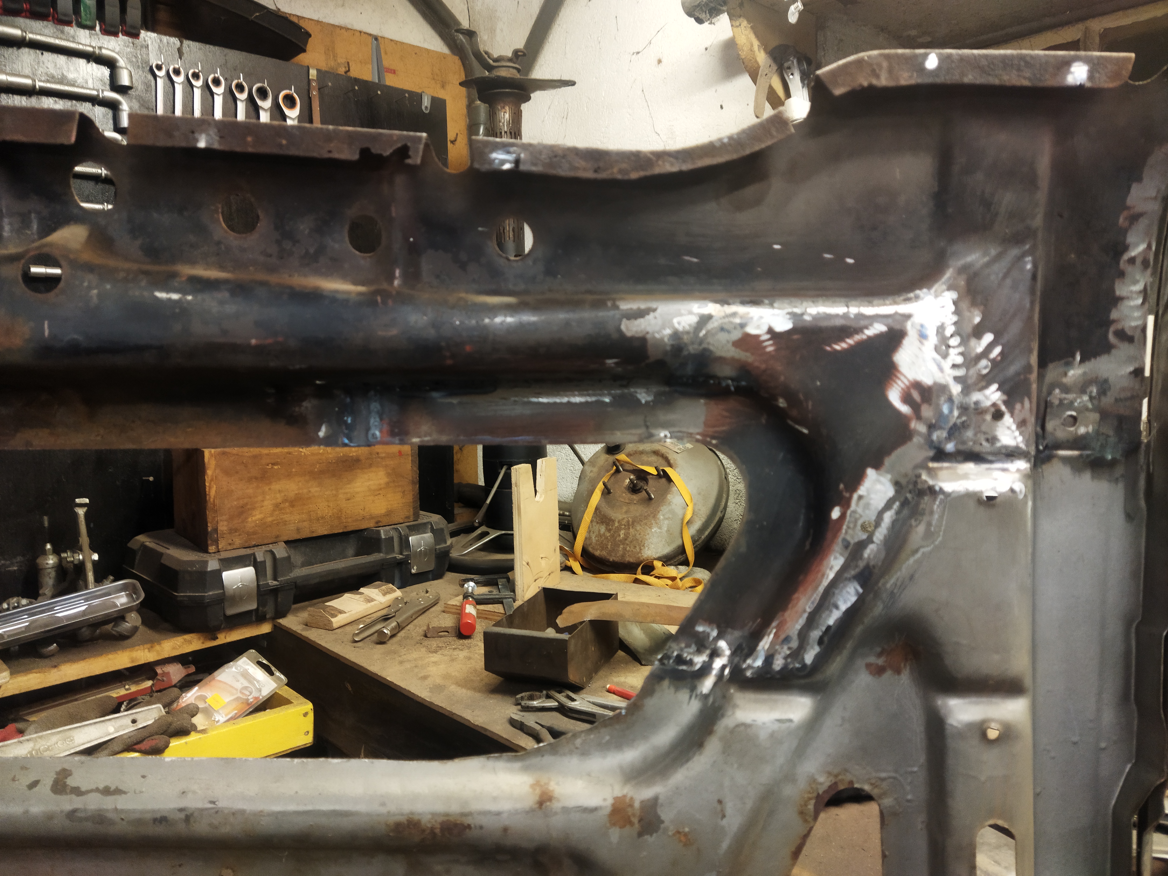 Pour la suite j'ai fait les découpes exacte pour pouvoir souder la peau de capot en bord à bord et j'ai dépointé le renfort avant du capot de Dart, ce qui m'a permis de voir que la rouille avait trouvée refuge dans les petits coins, donc je fabrique une matrice en bois afin de reproduire les formes et c'est parti pour découpage, formage et soudure afin de réparer cette traverse