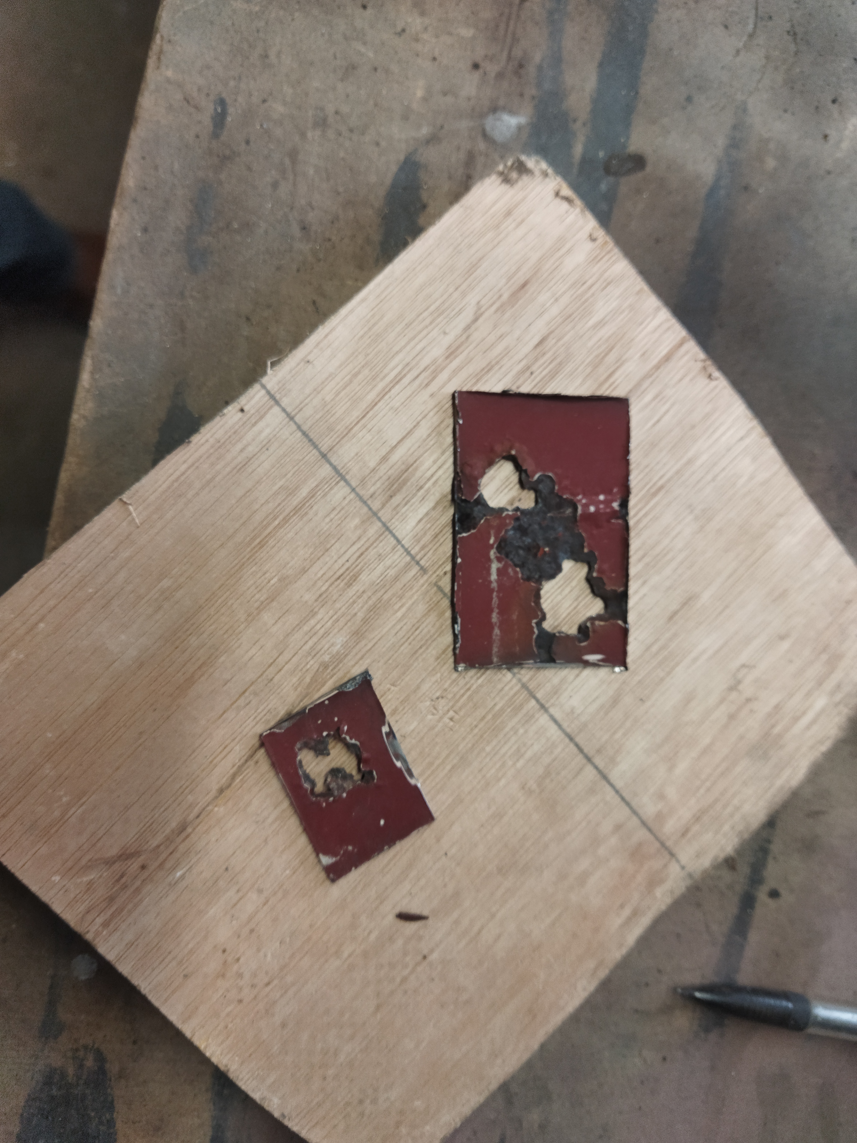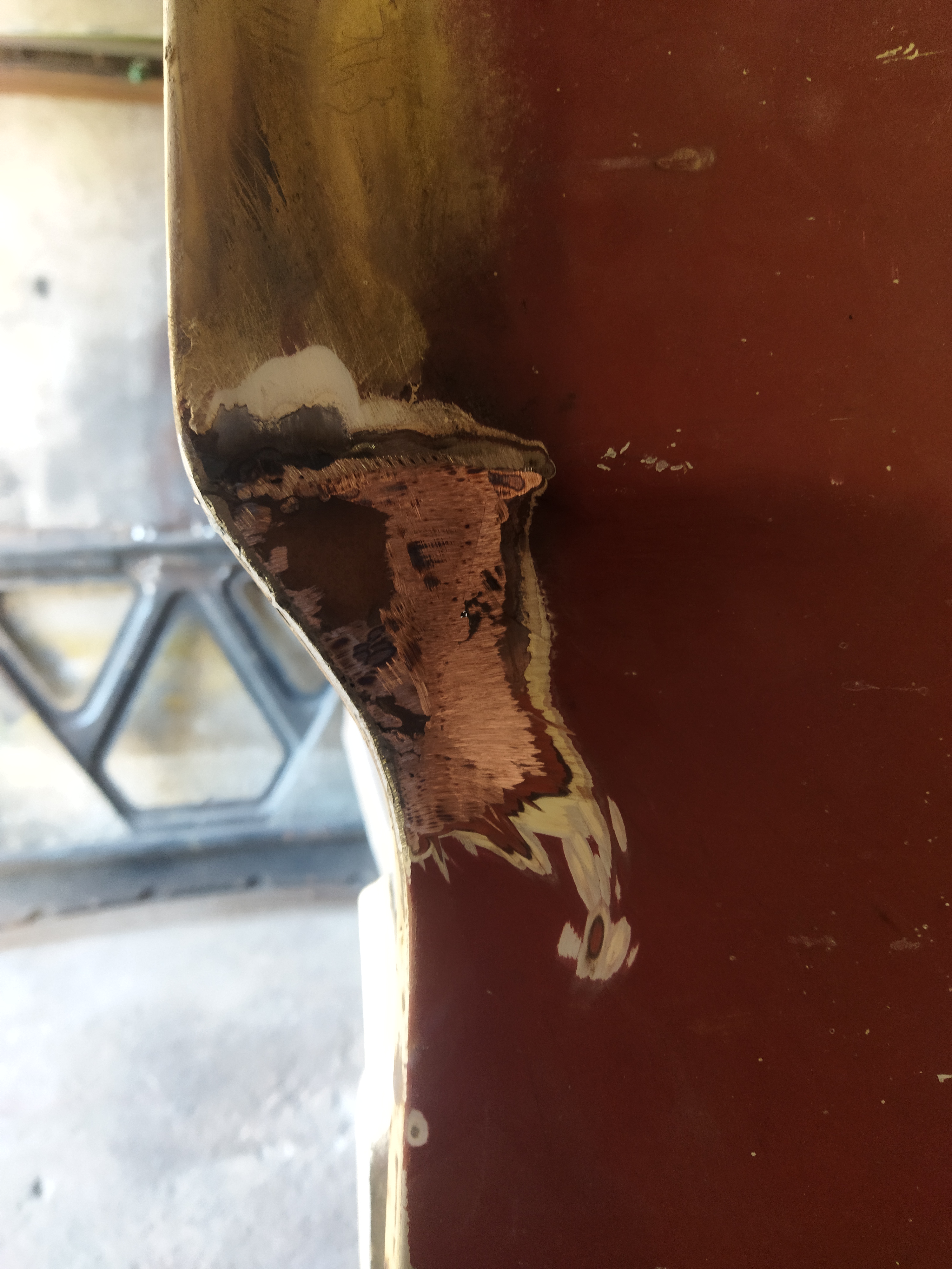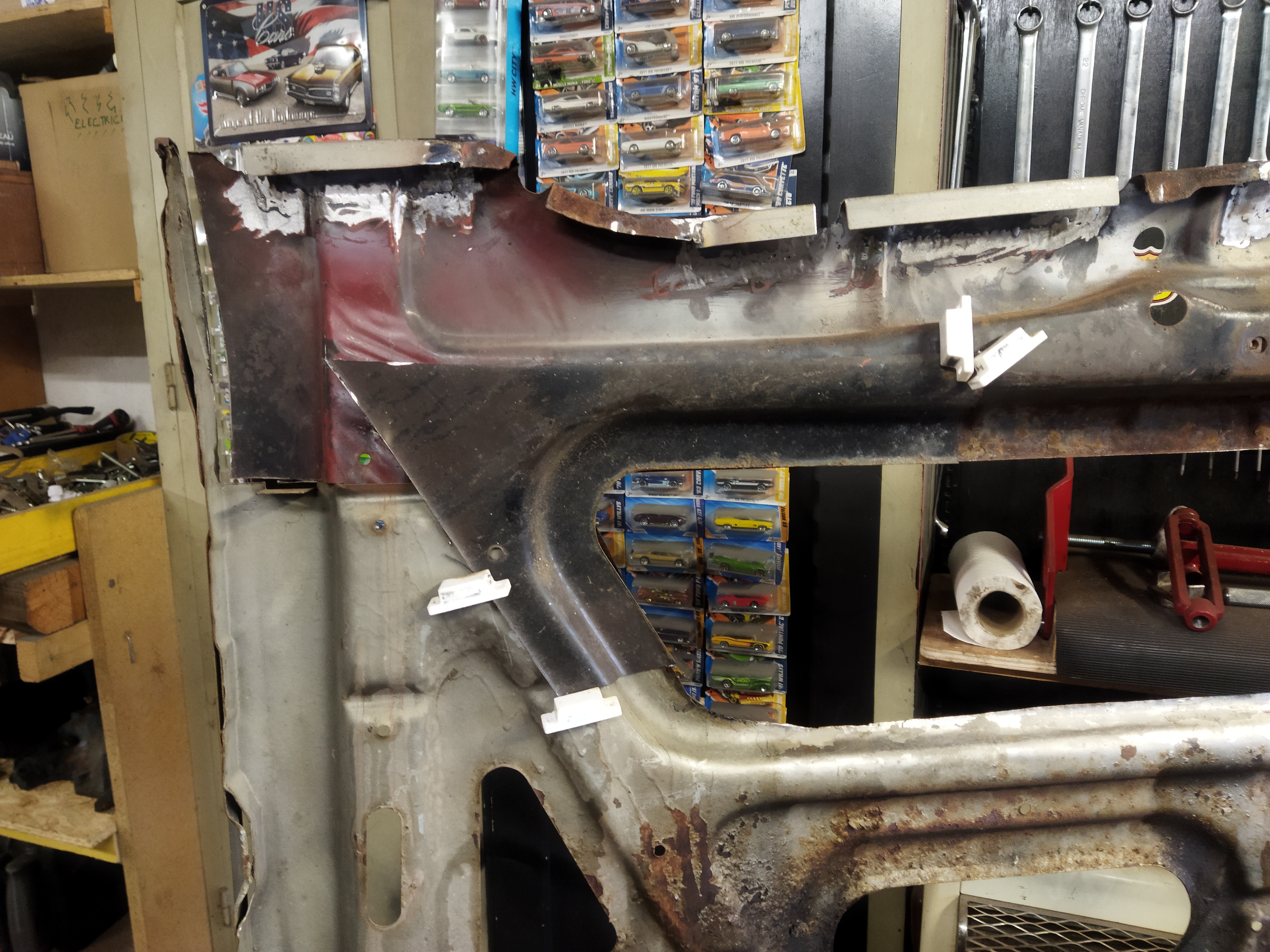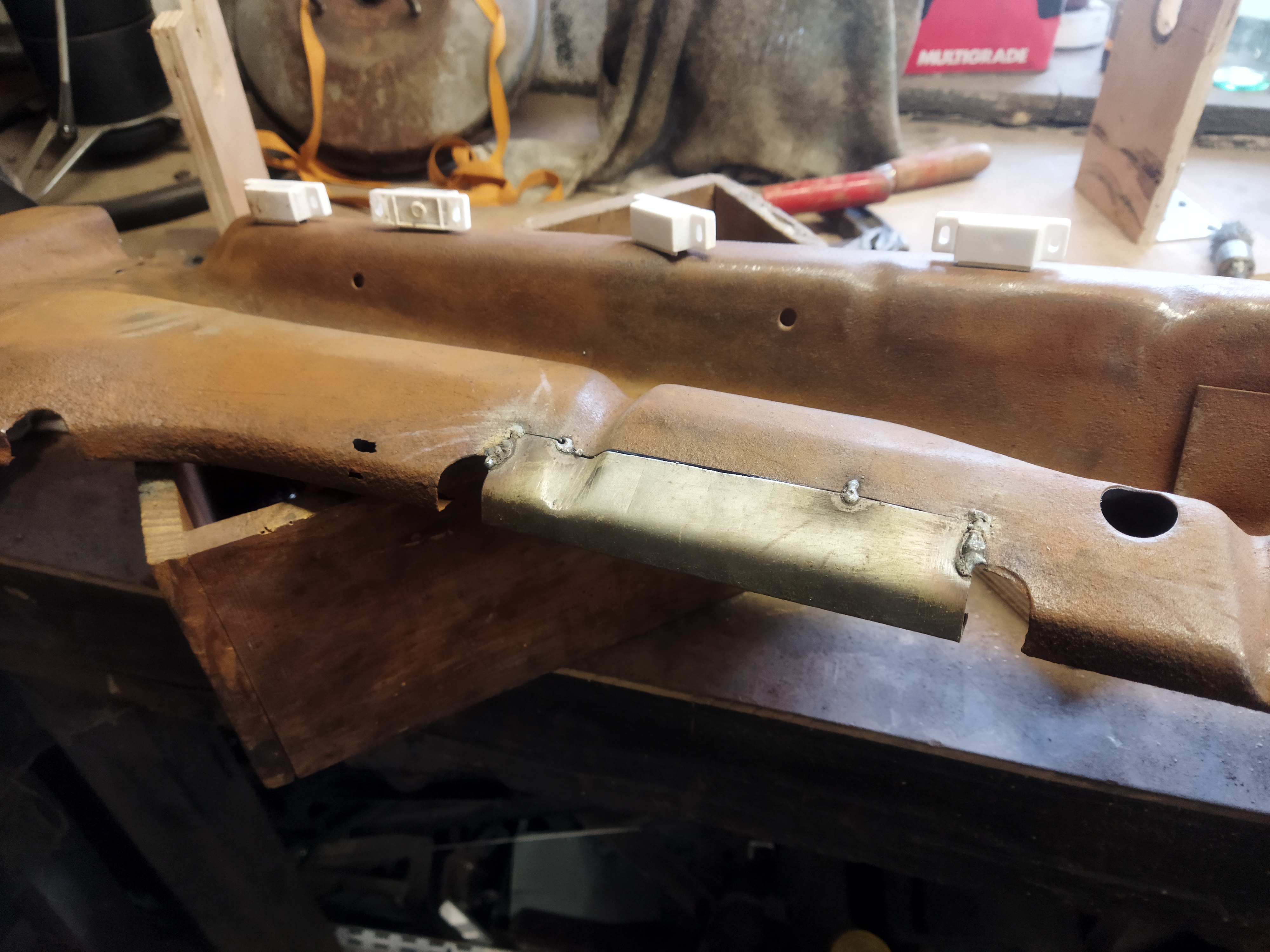 Pour la suite j'ai fait les découpes exacte pour pouvoir souder la peau de capot en bord à bord et j'ai dépointé le renfort avant du capot de Dart, ce qui m'a permis de voir que la rouille avait trouvée refuge dans les petits coins, donc je fabrique une matrice en bois afin de reproduire les formes et c'est parti pour découpage, formage et soudure afin de réparer cette traverse