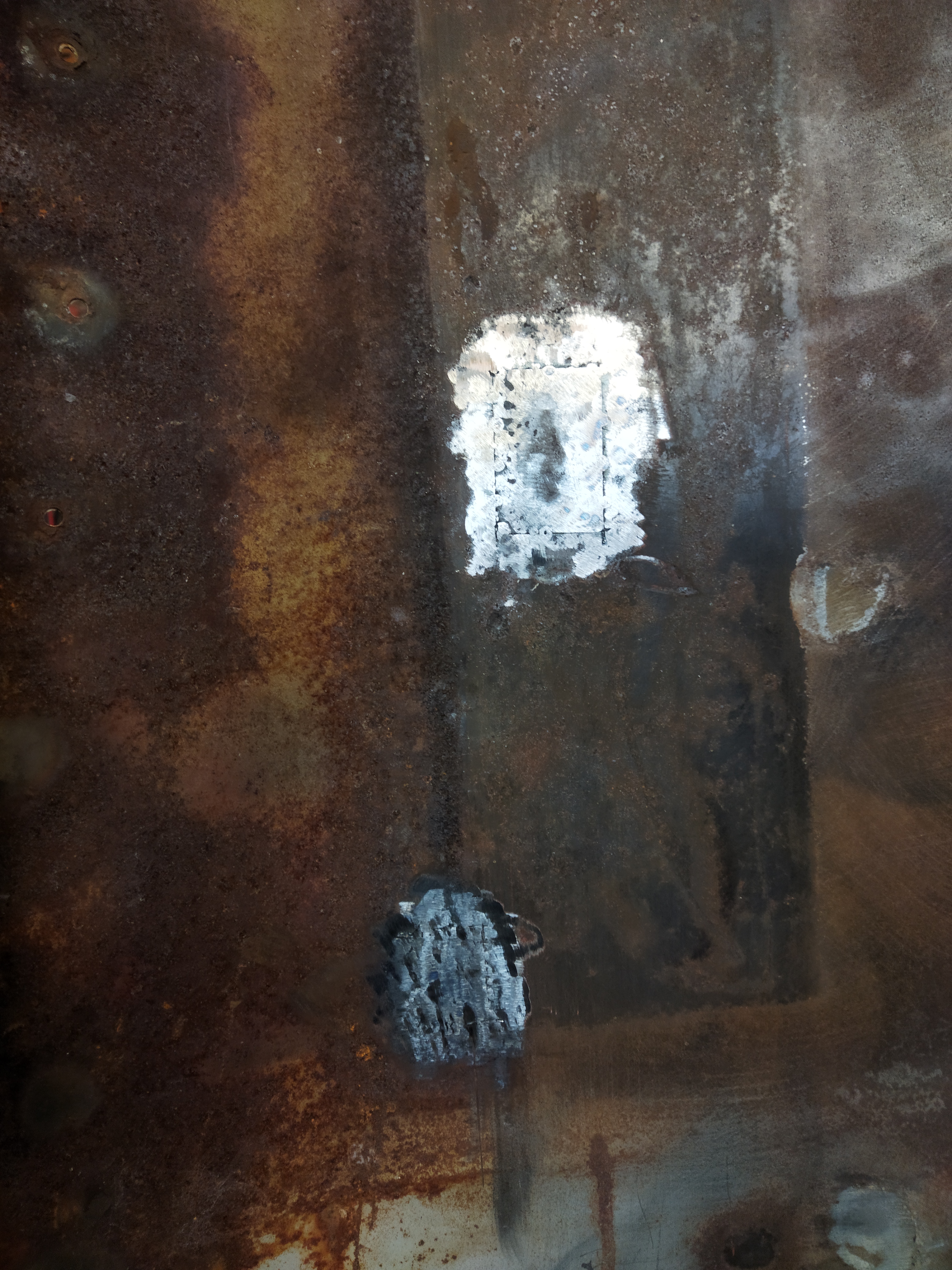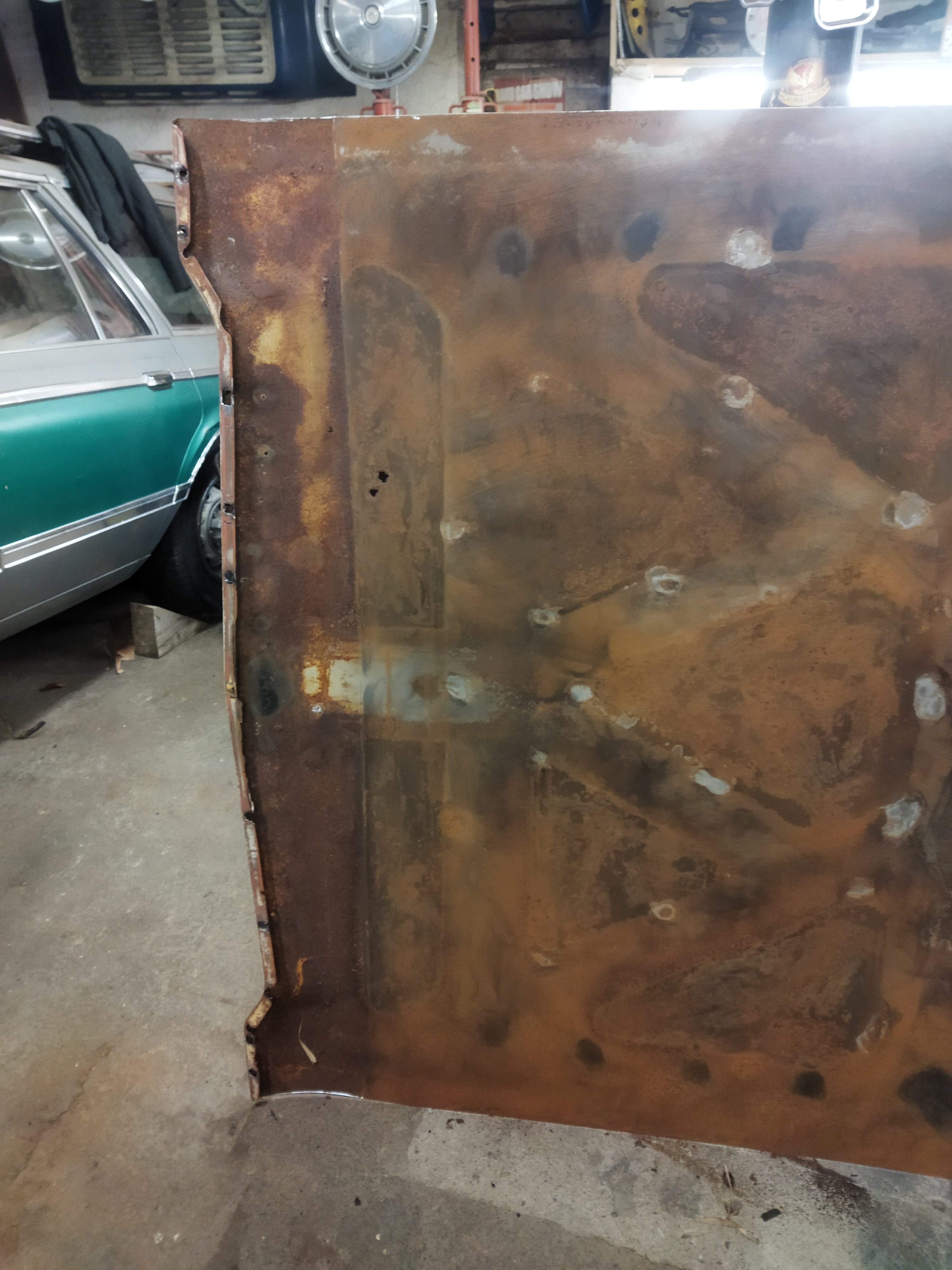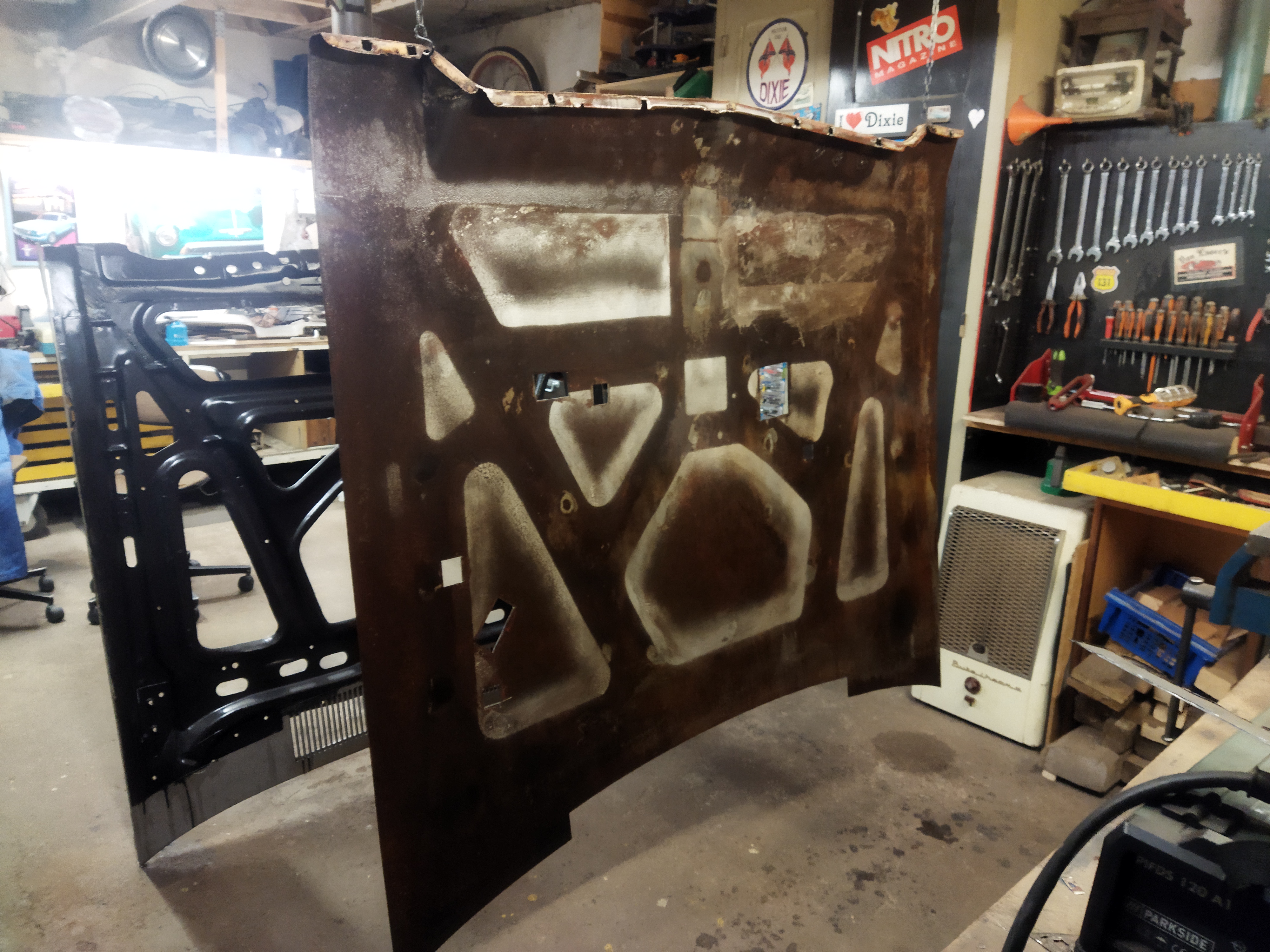 Allez la suite, la peau du capot de Dart est en plus mauvais état que prévu, du coup je fais les réparations sur le bord du capot, les parties à réparer dans le centre de la peau sont découpées, les patchs sont réalisés, mais les soudures seront faites plus tard quand la peau sera collée et soudée afin de limiter les déformations de la tôle