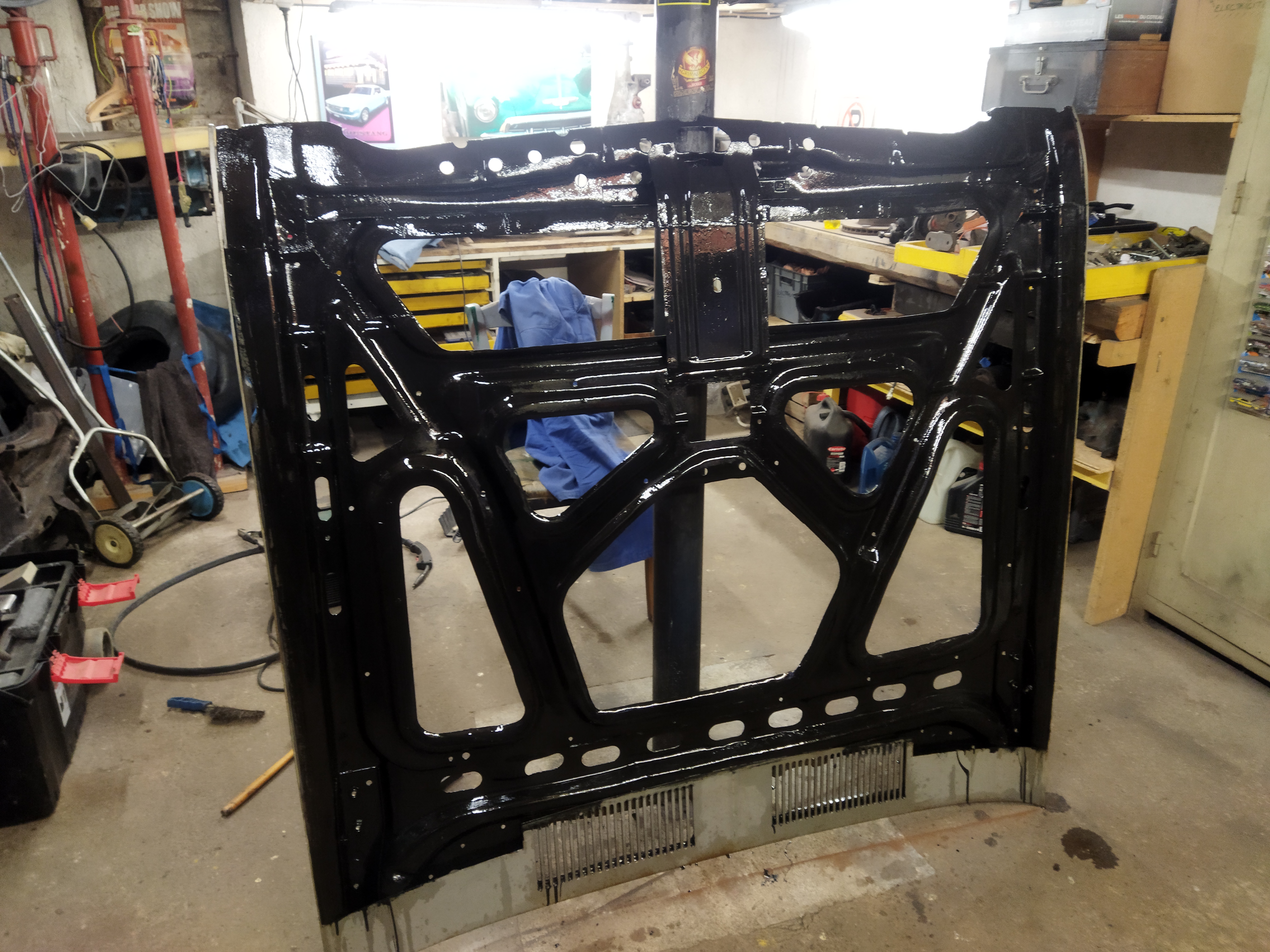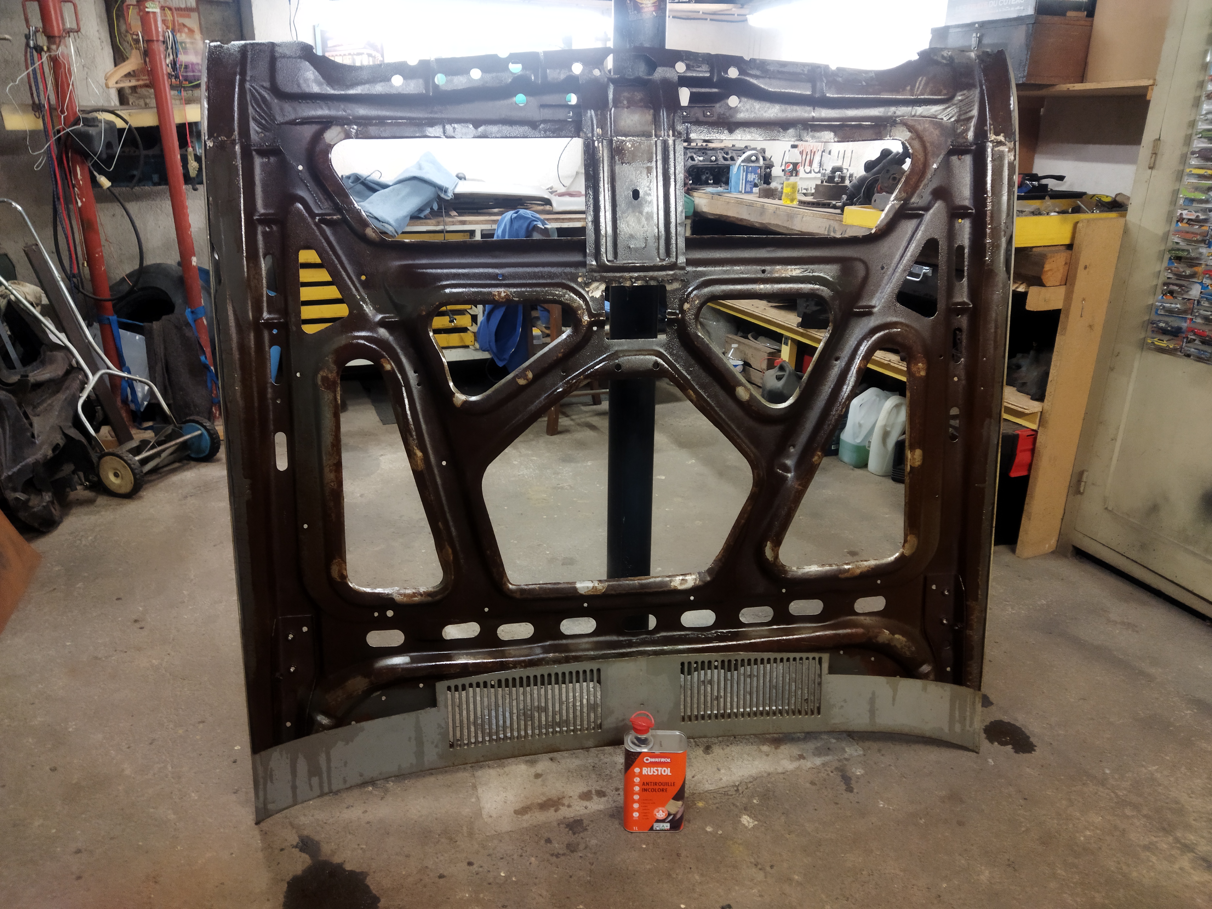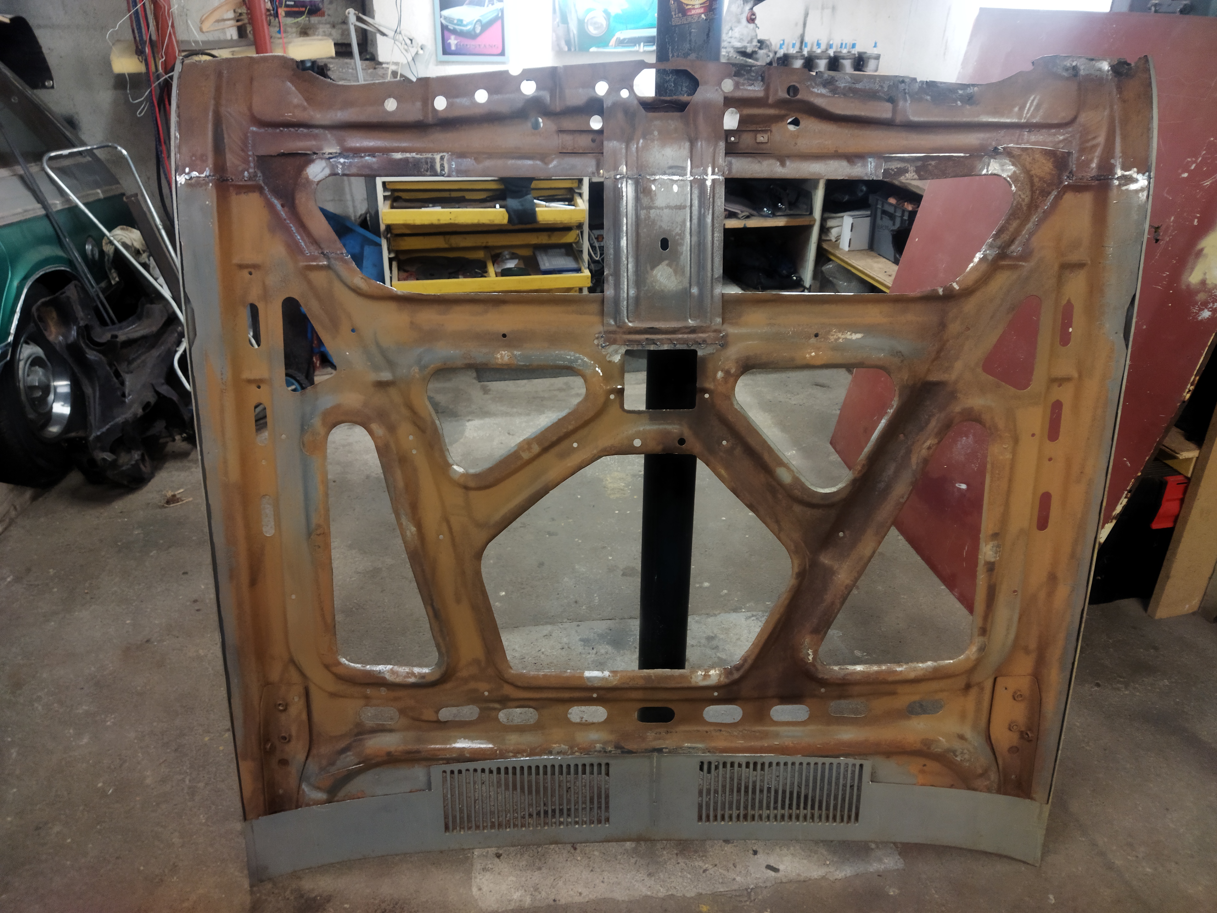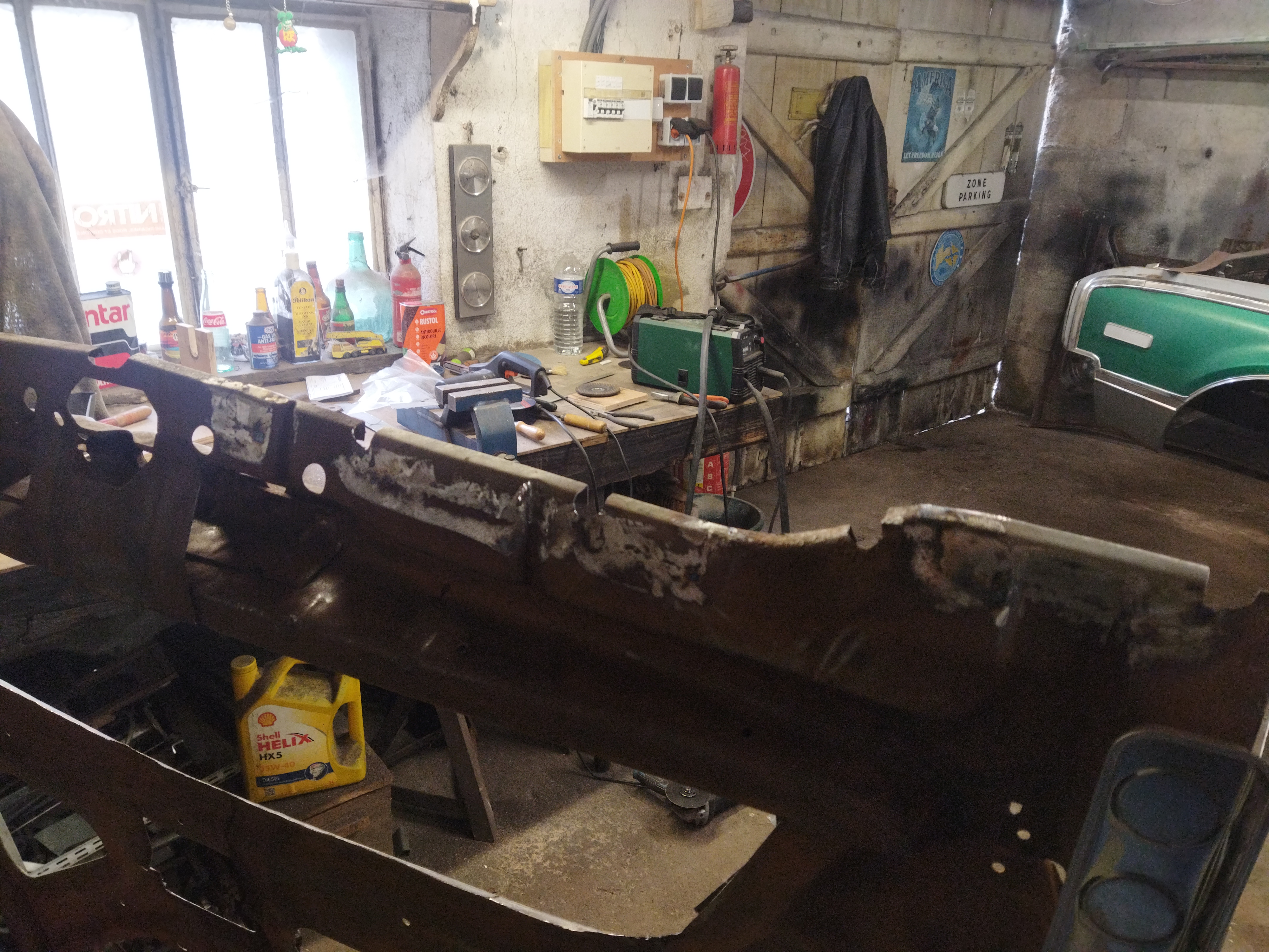 Une fois les découpes faites il faut assembler le tout, et de manière propre je récupère des arrondis sur le reste de la structure du capot de Dart afin de faire la jonction entre ma structure d'origine et la traverse avant de la Dart, je remets en place le renfort central de la Dart, puis après un brossage énergique je passe une bonne couche de Rustol, et plus tard je passe une couche de peinture antirouille noir diluée avec du Rustol. Normalement ça devrait rester propre une paire d'années