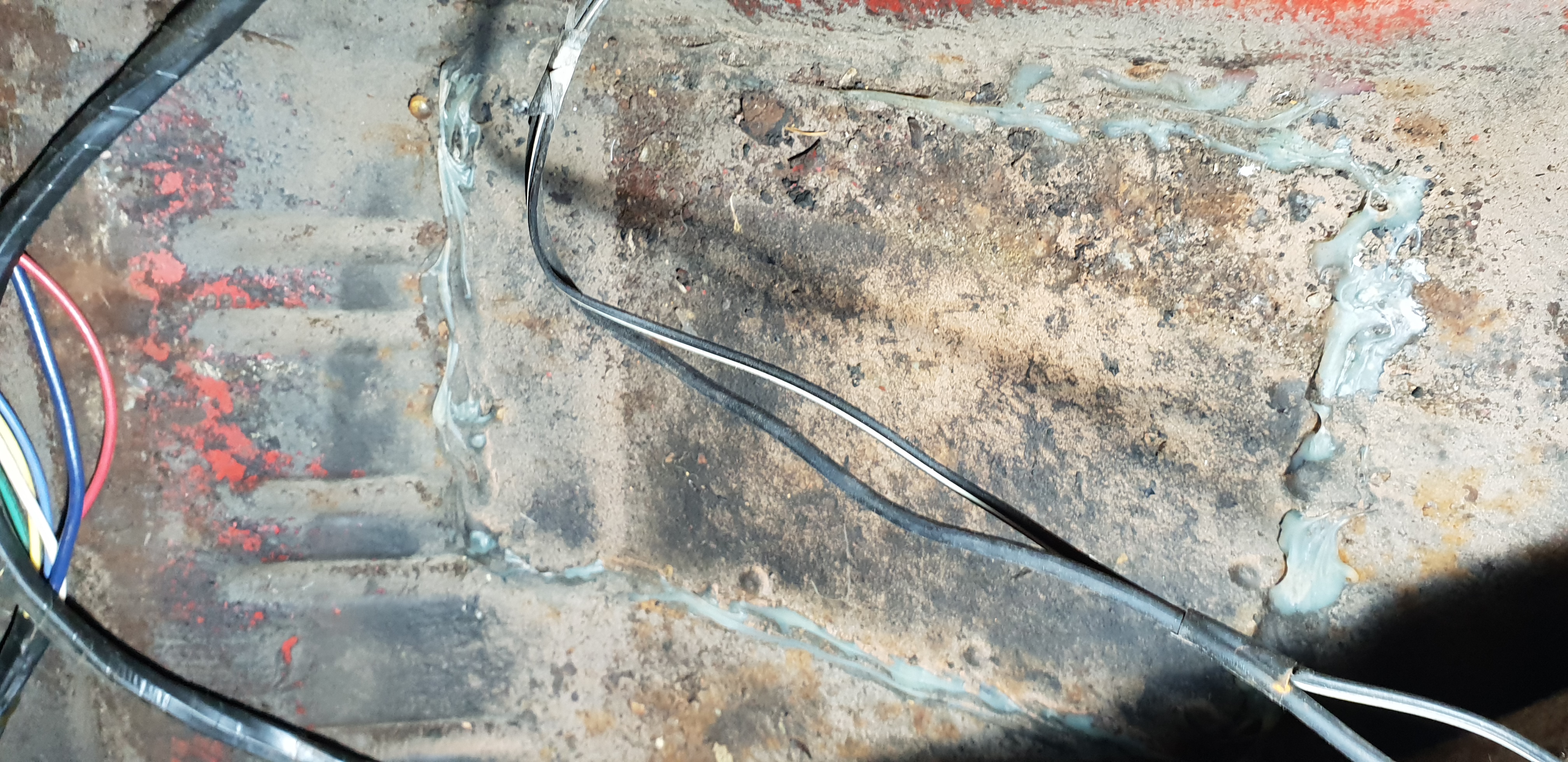 et j'ai bougé la moquette... là, il ya ... de la peinture rouge (en dessous de la crasse) et manifestement, le plancher a déjà été repris - c'est déjà ça que je n'aurai pas à faire, je pense,