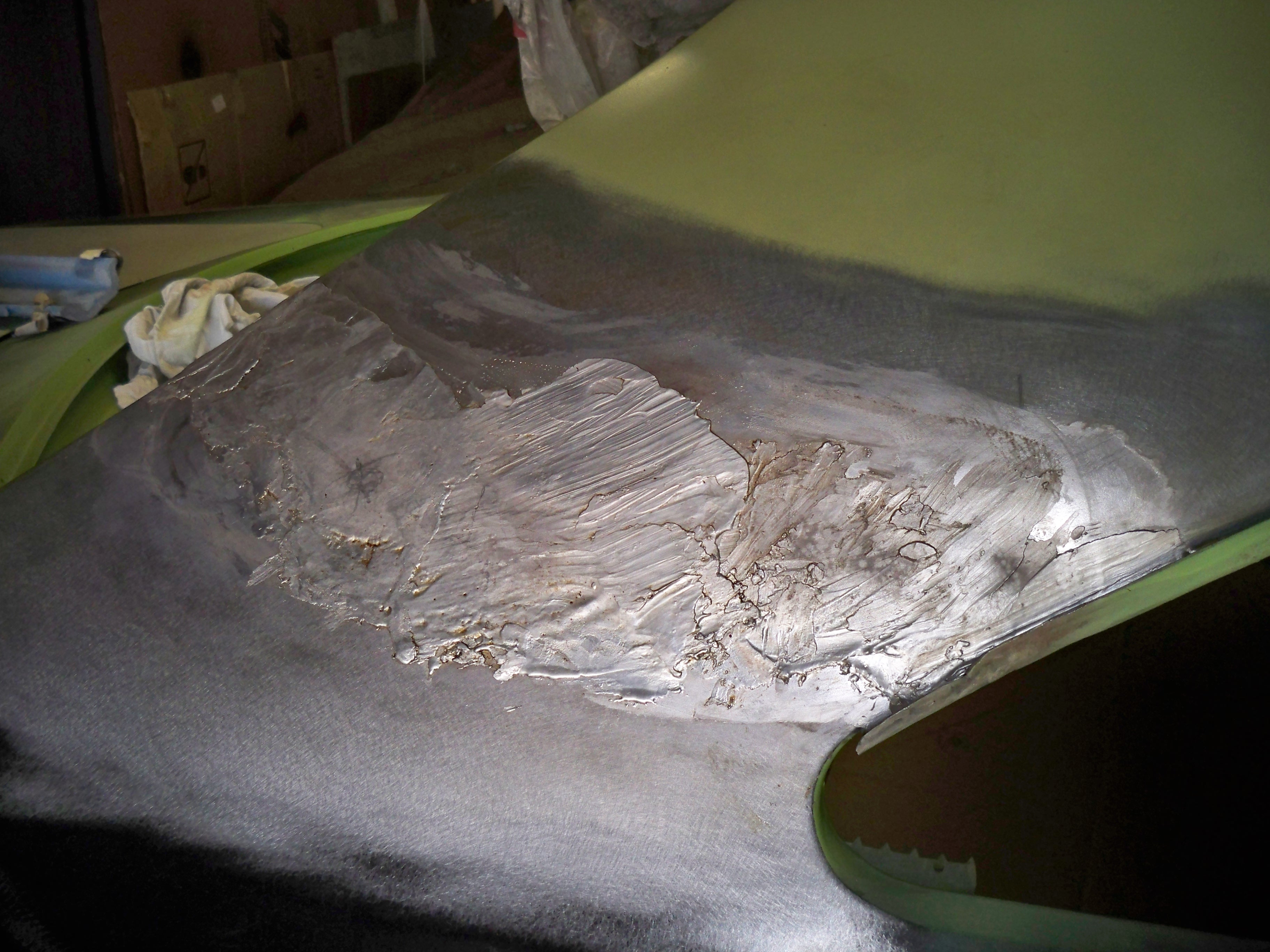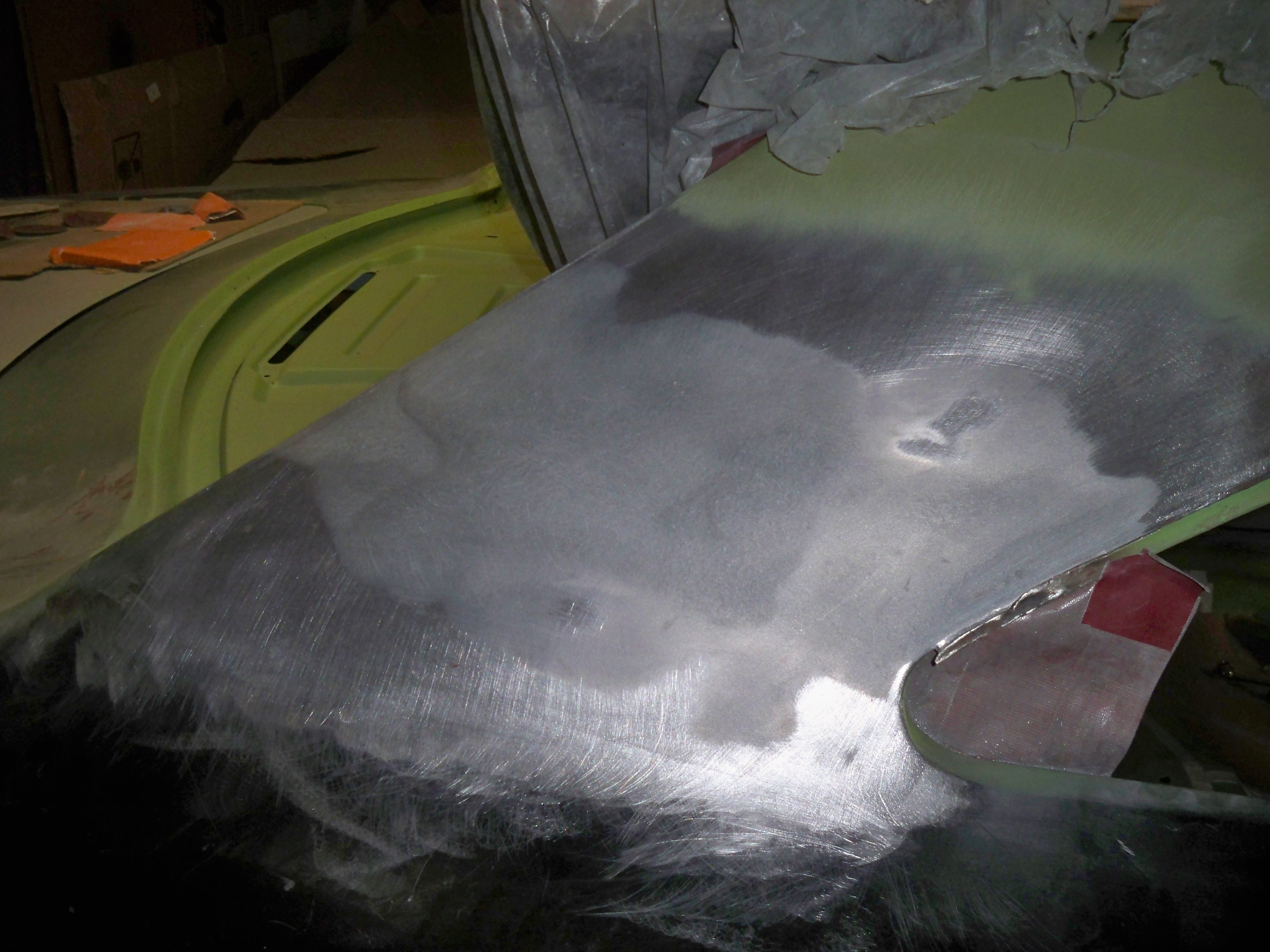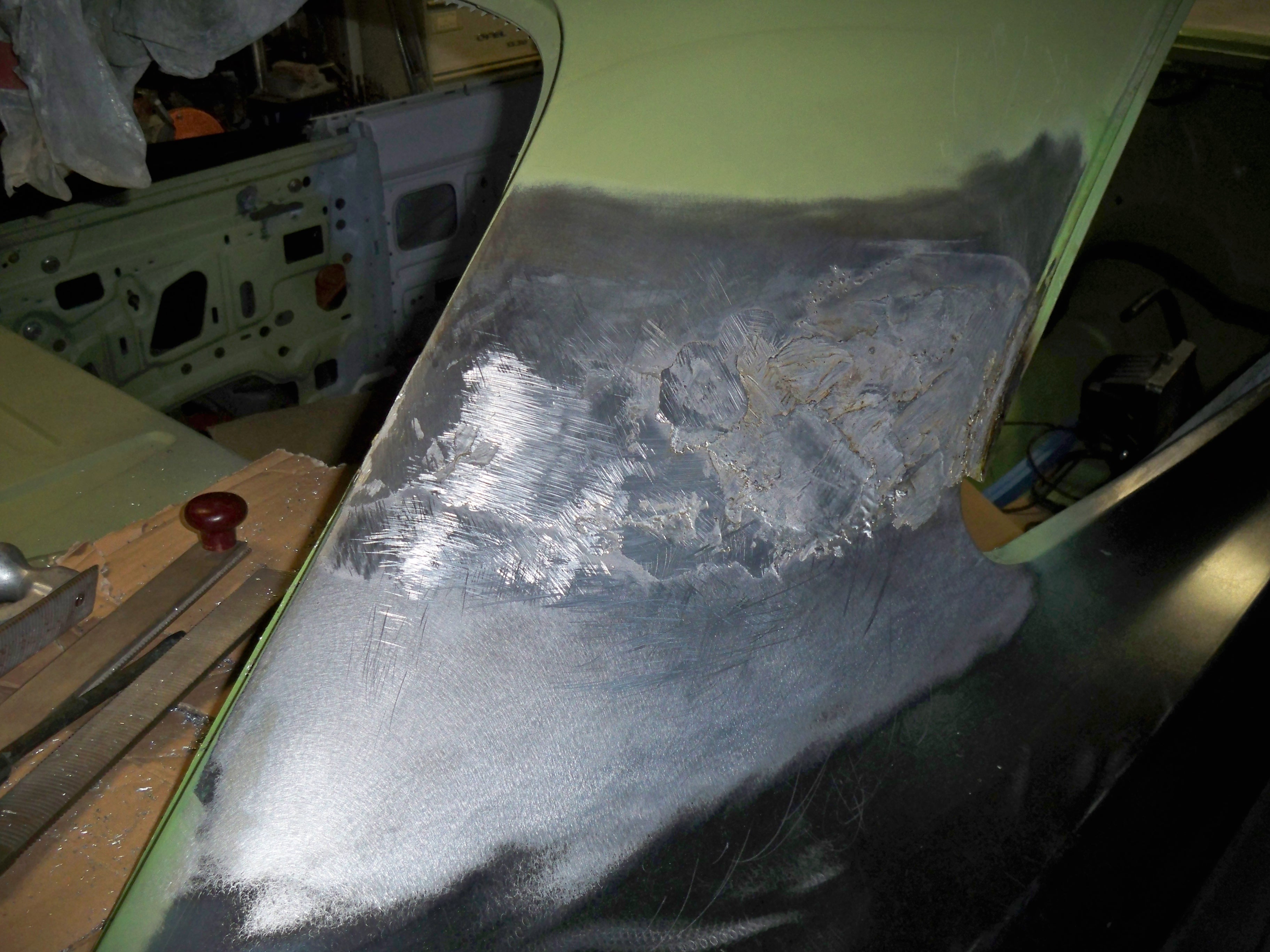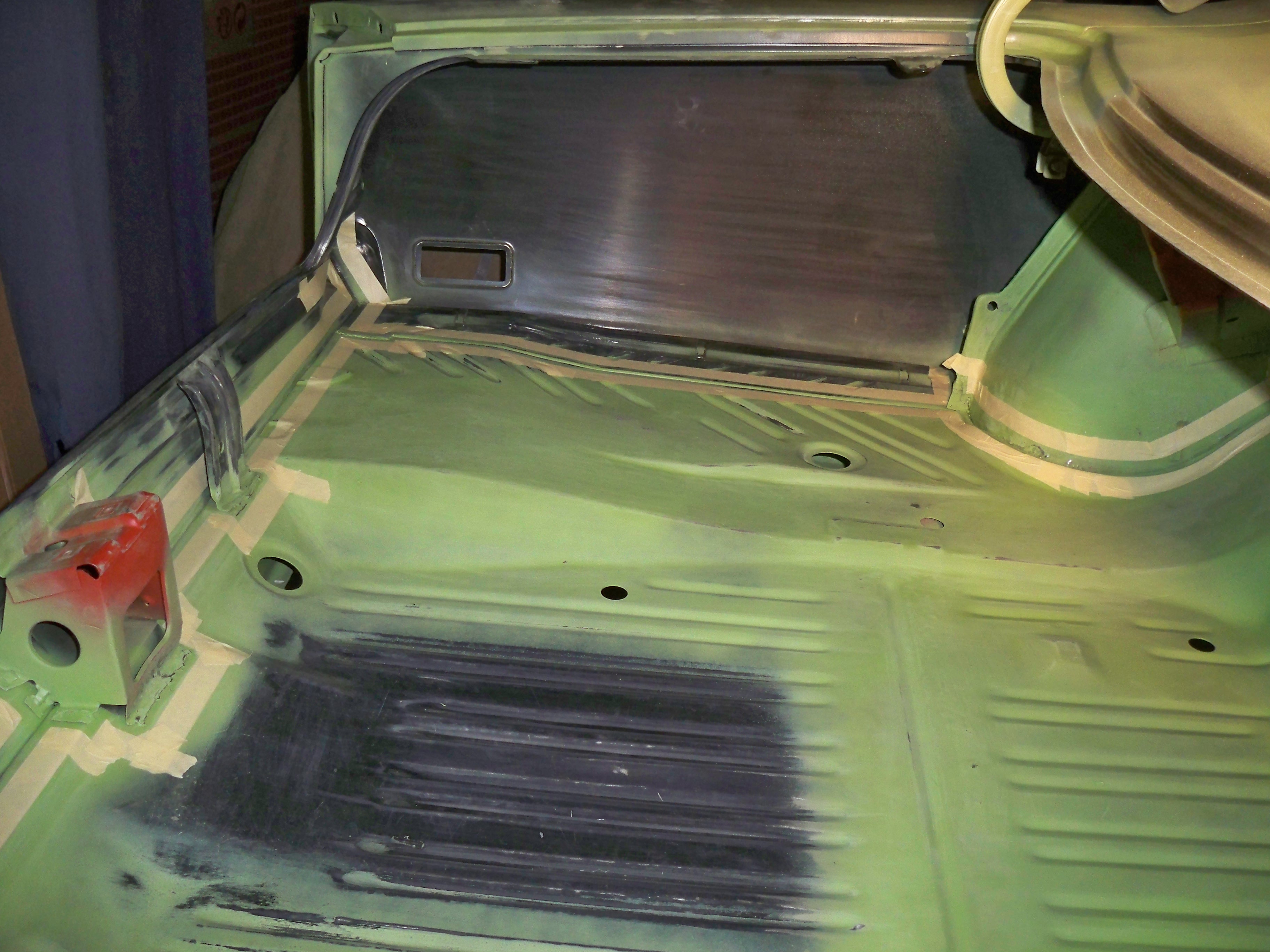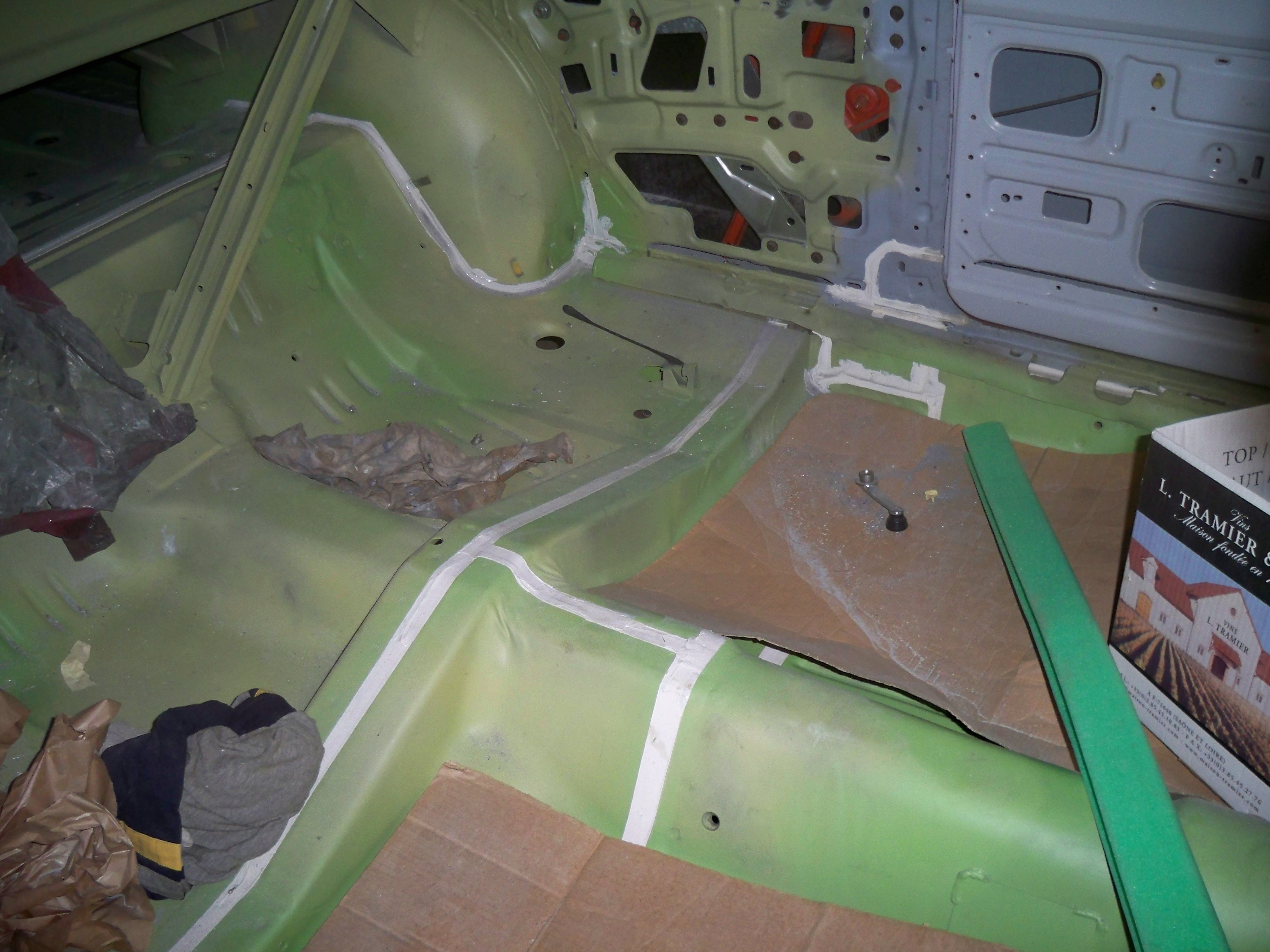 Plancher et tunel pour la boite 4 en place avec epoxy et pates de renforts maison pour les sièges. On a une banquette mais on hésite à mettre des sièges, du coup on a fait les renforts au cas ou.